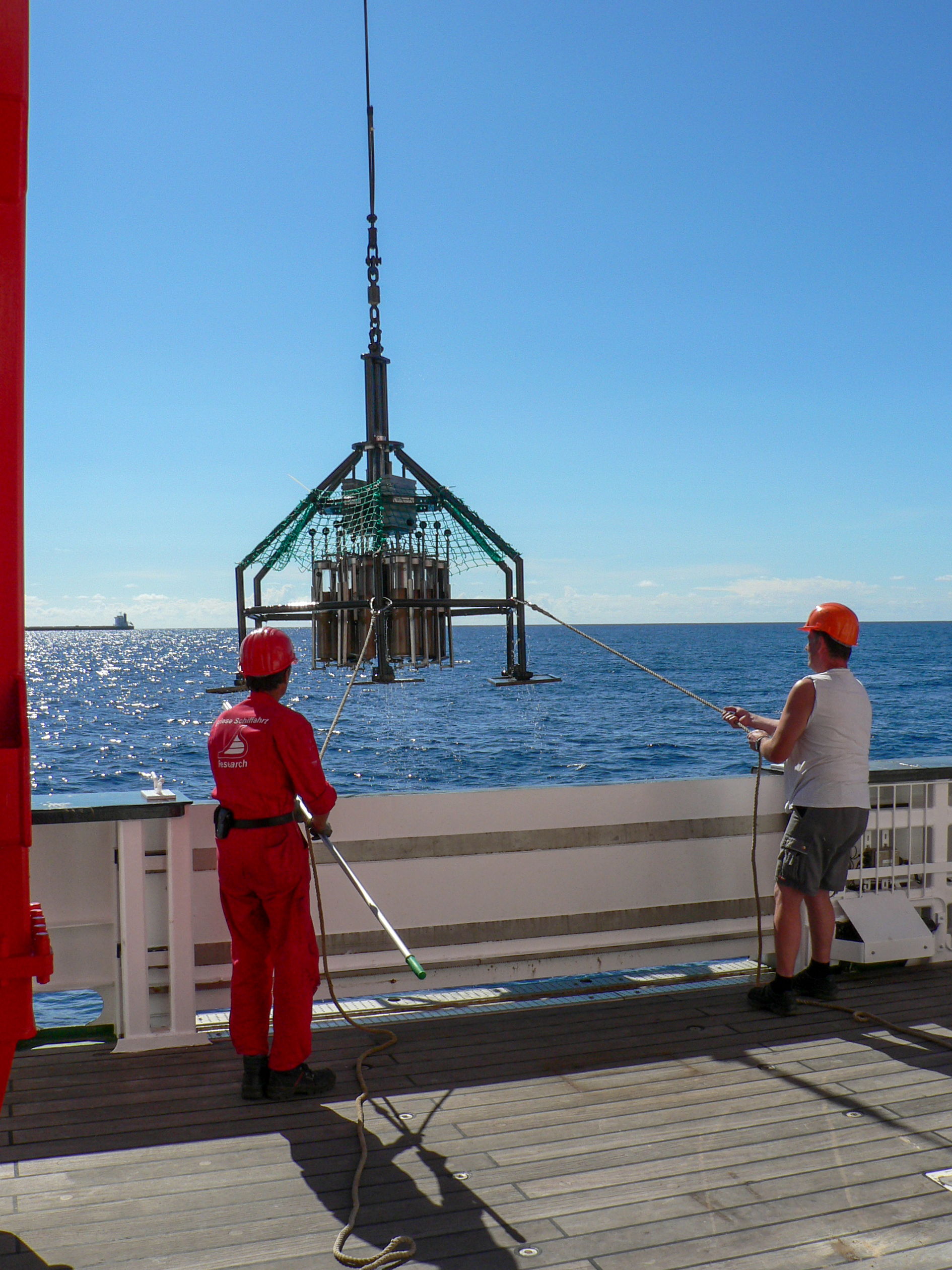 Ein weiteres Ziel der Expedition ist es, den Kreislauf von organischem Material im tiefen Ozean besser zu verstehen. Das Projekt INDICOM, am GEOMAR angesiedelt im Forschungsbereich Marine Biogeochemie von Professorin Dr. Anja Engel, untersucht so genannte Gelpartikel, die reich an Kohlenhydraten und Proteinen sind und eine wichtige Rolle beim mikrobiellen Abbau von Kohlenstoff spielen könnten. Dafür werden Wasserproben mit Hilfe eines Kranzwasserschöpfers aus unterschiedlichen Tiefen des Indischen Ozeans genommen, um biogeochemische und biologische Parameter wie etwa die Bakterienaktivität zu bestimmen. Diese Forschung ist entscheidend für das Verständnis der Kohlenstoffflüsse im Ozean und kann zur Verbesserung von Klimamodellen beitragen.