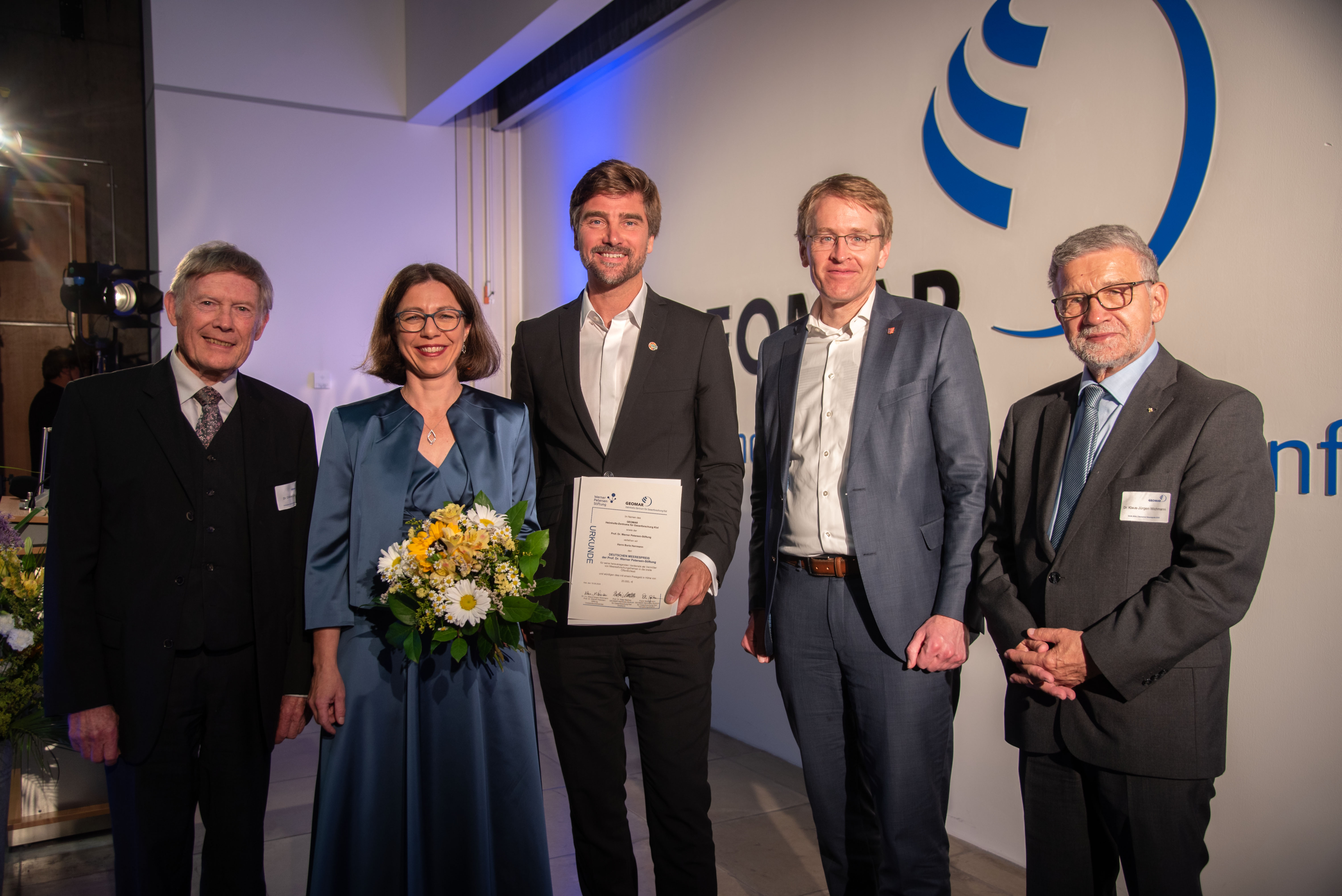 Boris Herrmann (Mitte) ist Träger des Deutschen Meerespreises 2024. Es gratulieren (von links nach rechts): Dr. Christian Zöllner, stellvertretender Vorsitzender und Geschäftsführer der Prof. Dr. Werner-Petersen-Stiftung, GEOMAR-Direktorin Professorin Dr. Katja Matthes, Daniel Günther, Ministerpräsident des Landes Schleswig-Holstein, und Dr. h. c. Klaus-Jürgen Wichmann, Vorsitzender der Prof. Dr. Werner-Petersen-Stiftung. Foto: Thomas Eisenkrätzer, GEOMAR