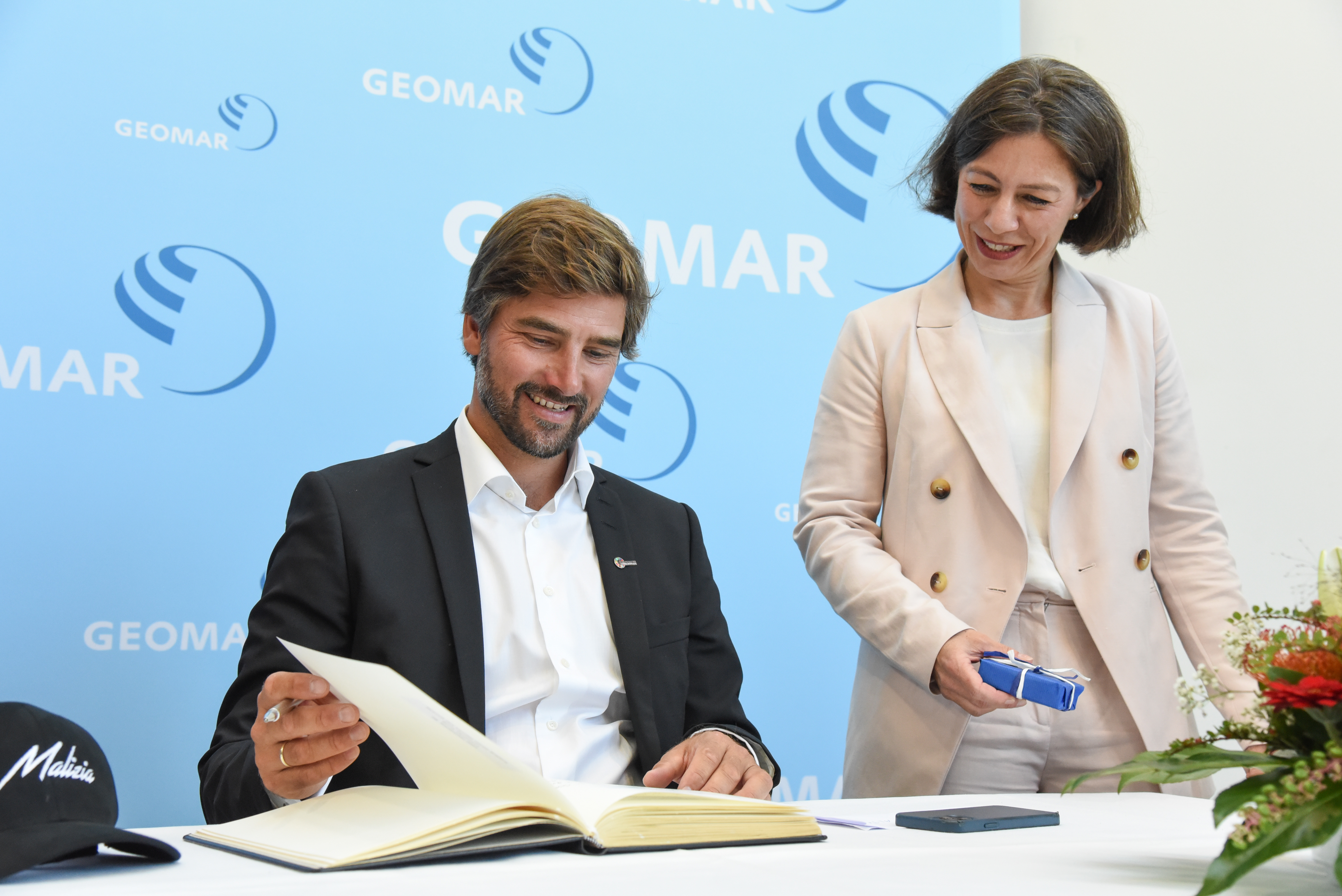 Bei einem Besuch am GEOMAR am 8. September 2021 trug sich Boris Herrmann in Anwesenheit von GEOMAR-Direktorin Professorin Dr. Katja Matthes ins Gästebuch ein. Foto: Thomas Eisenkrätzer, GEOMAR