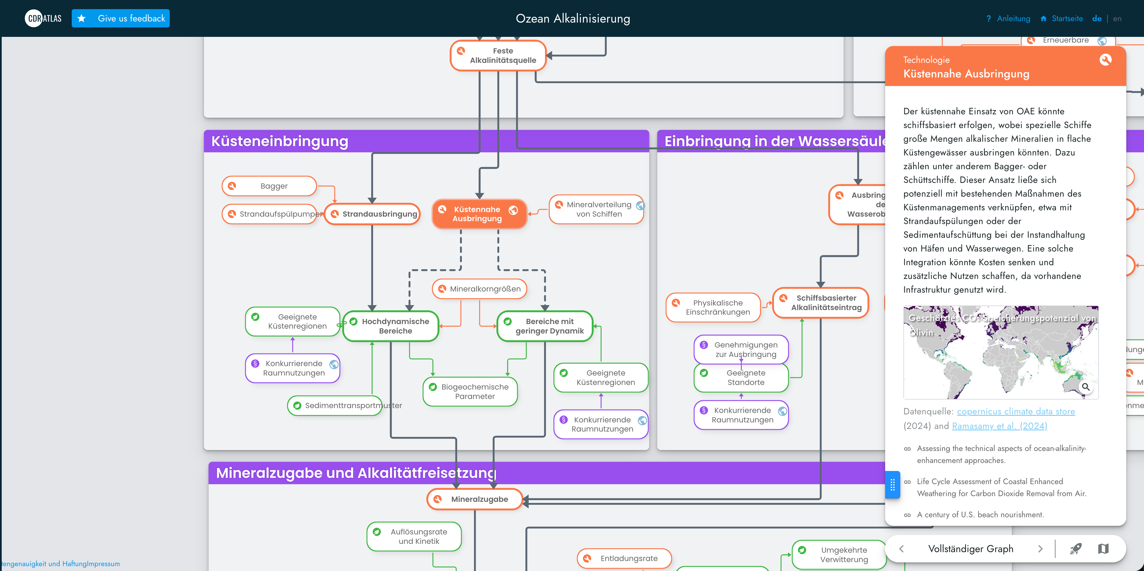 Kernstück der Plattform sind detaillierte Prozessketten für verschiedene CDR-Methoden. Sie zeigen, welche Schritte notwendig sind – von der Planung über die Umsetzung bis hin zur Überwachung der CO2-Speicherung. Fachlich nennt sich das Monitoring, Reporting and Verification (Überwachung, Berichterstattung und Überprüfung). Im CDRatlas wird dieses Konzept leicht verständlich erklärt und in den jeweiligen Kontext eingeordnet.