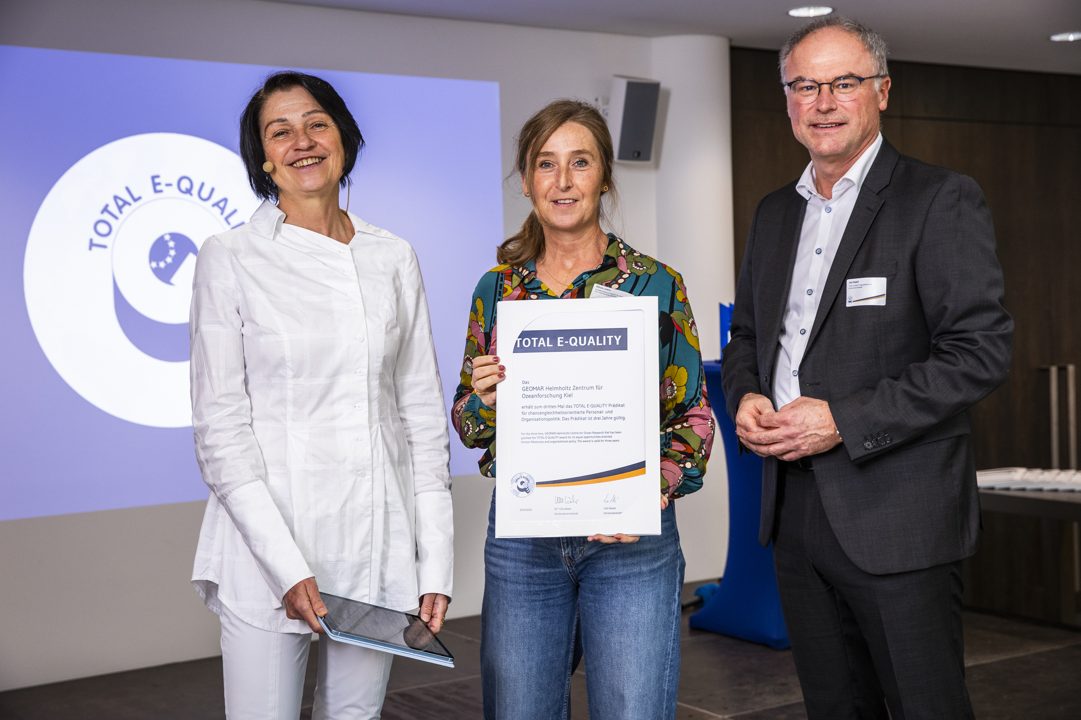 Bereits zum dritten Mal durfte Nikole Lorenz (m.) das TOTAL E-QUALITY-Prädikat für das GEOMAR entgegennehmen. Hier mit den TEQ-Vorstandsvorsitzenden Dr.in Ulla Weber und Udo Noack bei der Verleihungszeremonie in Dortmund. Foto: Sarah Rauch, TOTAL E-QUALITY Deutschland e.V.