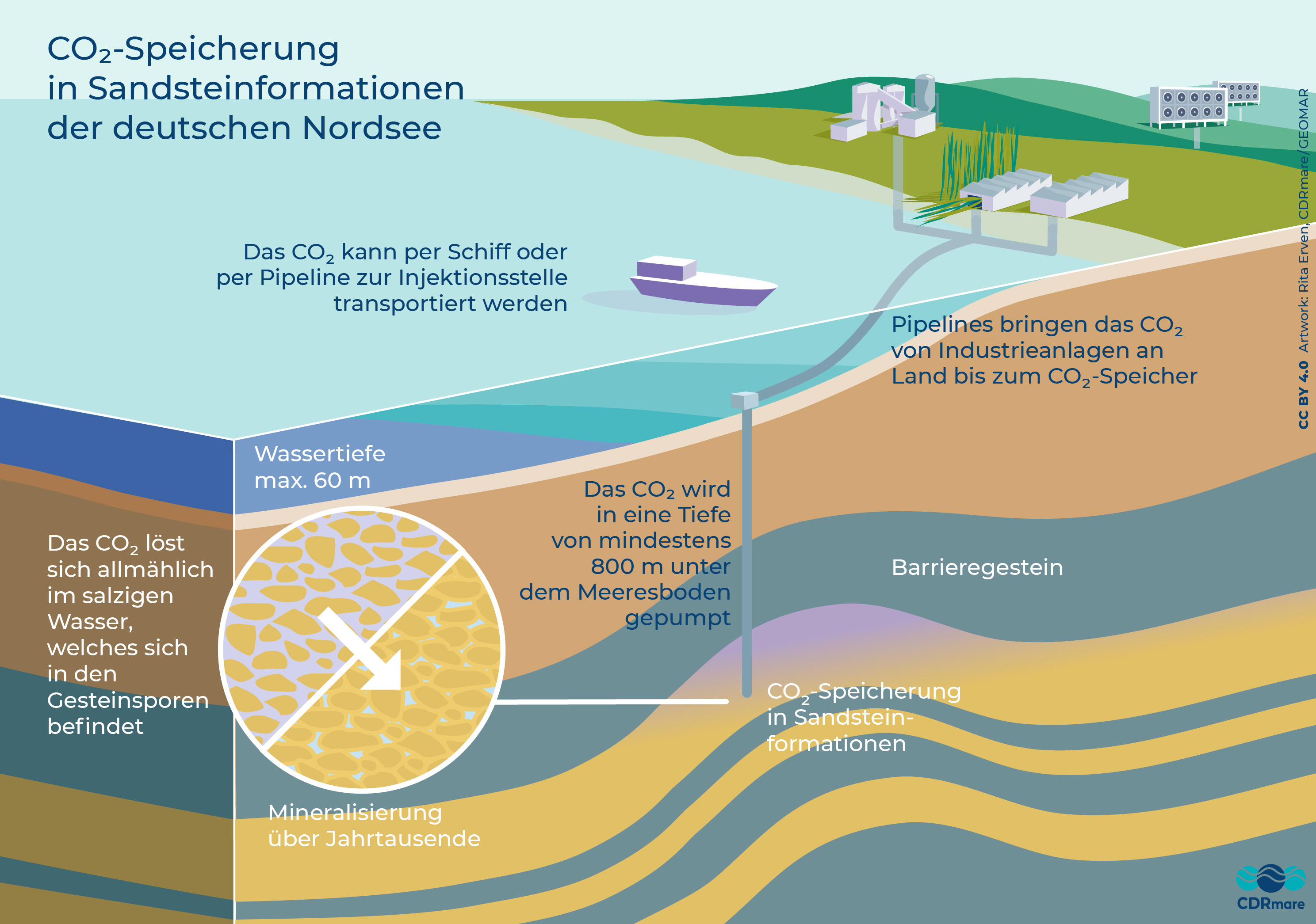 Abgeschiedenes Kohlendioxid (CO2) kann tief unter der deutschen Nordsee gespeichert werden. Aufgrund der begrenzten Kapazitäten und möglicher Umweltrisiken sollte dort aber nur jene CO2-Restmenge deponiert werden, deren Entstehung sich trotz konsequenter Klimapolitik nicht vermeiden lässt. Grafik: Rita Erven, CDRmare, GEOMAR