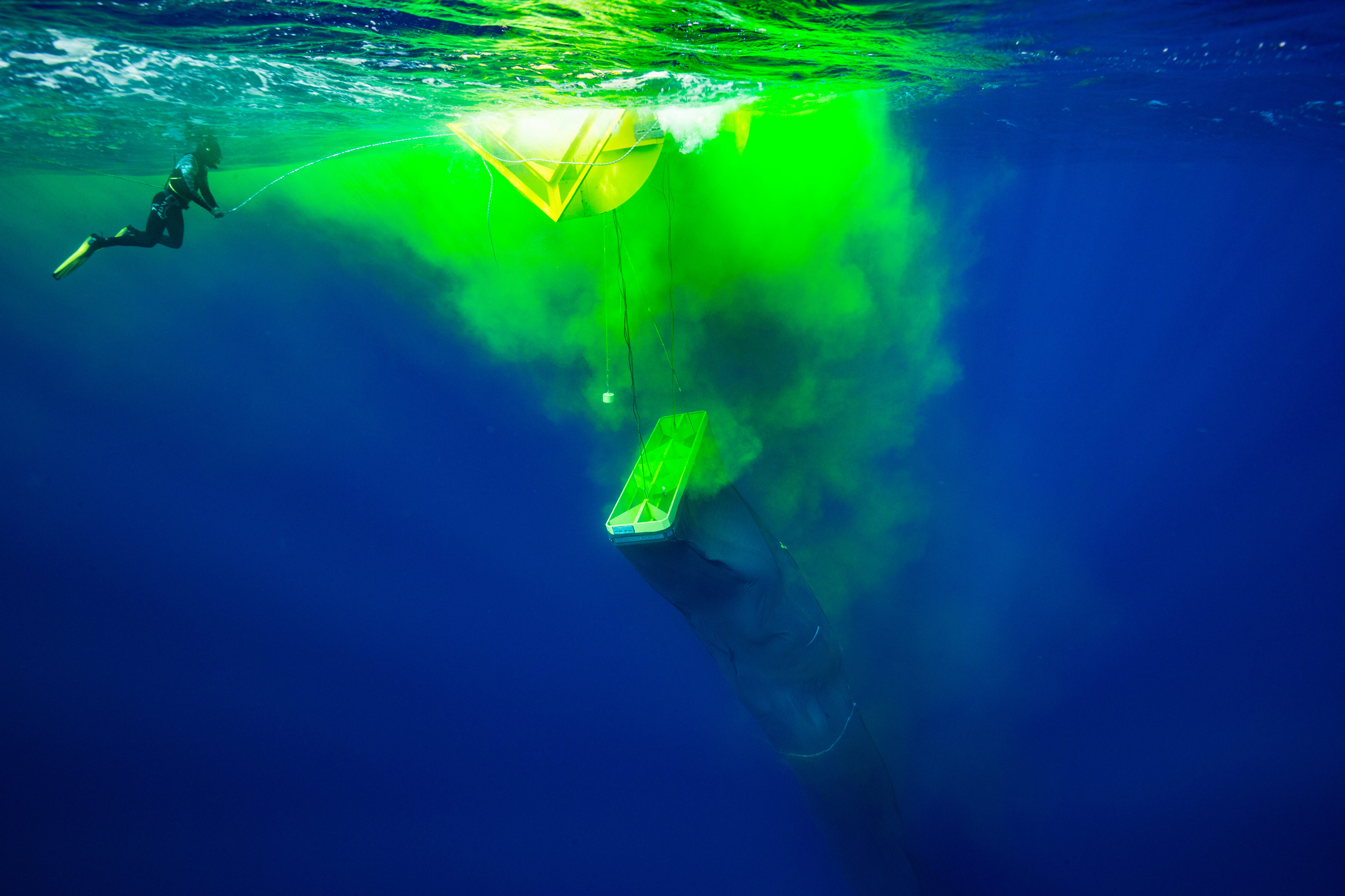 Um die Ausbreitung des Tiefenwassers in der Oberflächenschicht zu verfolgen, haben Taucher des GEOMAR am Tag nach dem Aussetzen den für die Umwelt unbedenklichen Fluoreszenzfarbstoff Uranin zehn Meter unterhalb des Pumpenauslasses eingeleitet. Mit Videoaufzeichnungen der Taucher und Messsonden von Bord der Segelyacht Pandora V sollte versucht werden, das durch den Farbstoff markierte ausströmende Wasser nachzuverfolgen. Zur Überraschung des GEOMAR-Teams war zu dem Zeitpunkt keine Pumpaktivität nachzuweisen. Wie sich später aus Daten eines Dehnungsmessers an der Pumpe herausstellte, trieb die Wellenpumpe zu diesem Zeitpunkt bereits ohne Grundgewicht durchs Wasser. Die Ursache, warum sich das Grundgewicht vom Pumpschlauch gelöst haben könnte, ist aktuell unklar und wird vermutlich erst beim Einholen der Wellenpumpe durch die Sarmiento de Gamboa zum Ende der noch laufende Forschungsexpedition geklärt werden können.