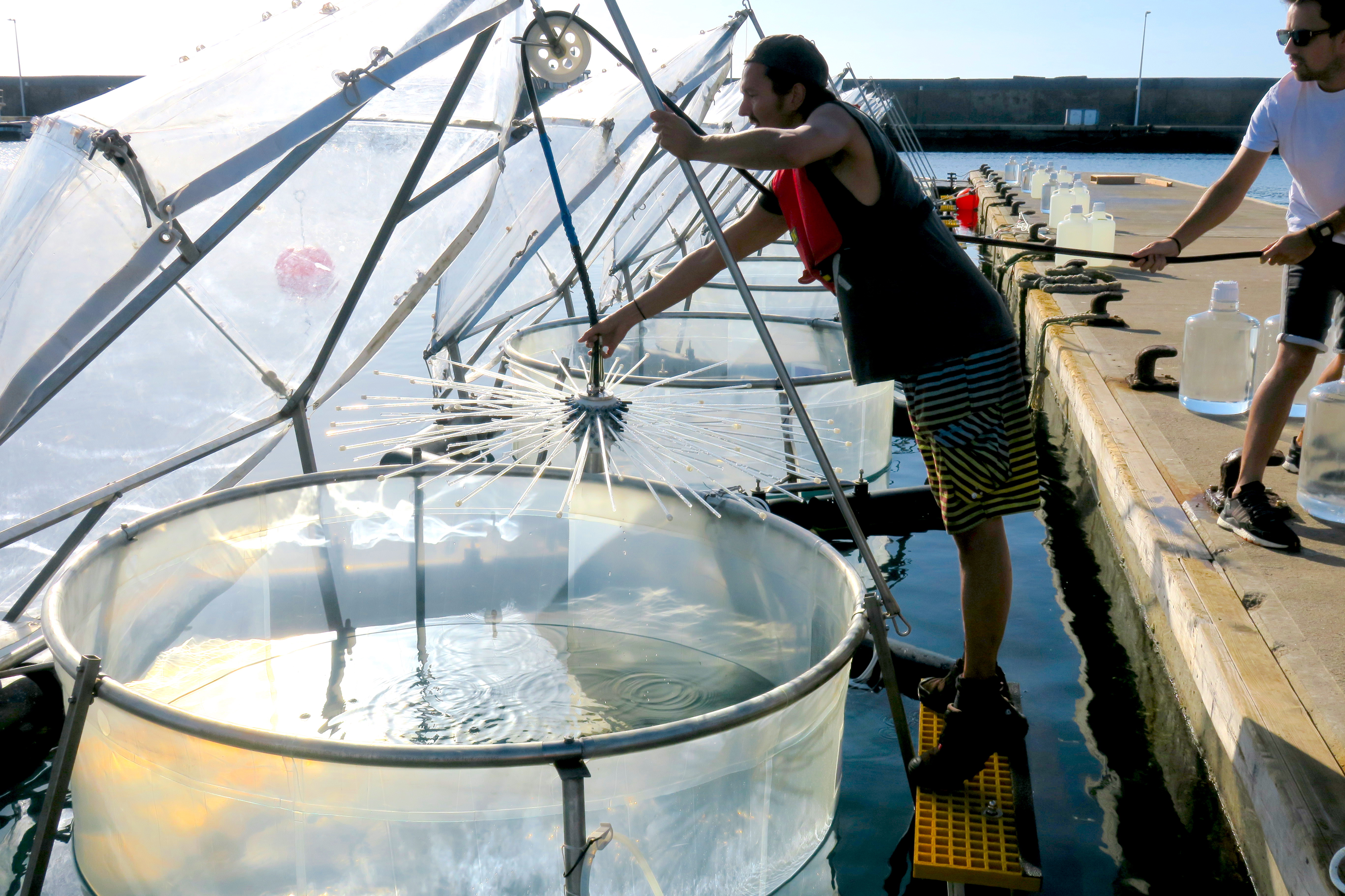 In übergroßen Reagenzgläsern im Meerwasser, sogenannten Mesokosmen, simulieren die Forscherinnen und Forscher beschleunigte Verwitterung von Gestein durch Zugabe von Mineralien, wie sie auch durch natürliche Prozesse in die Ozeane eingetragen werden. Je Kilogramm gelöster Gesteinsmineralien kann bei diesem Ansatz etwa ein halbes Kilogramm CO2 zusätzlich im Meerwasser gebunden werden. In den neun Mesokosmen wurden unterschiedliche Mengen an Mineralien mit der entsprechenden Menge an CO2 zugegeben. Der so eingestellte Konzentrationsgradient soll Aufschluss über mögliche Grenzwerte zur Umweltverträglichkeit von beschleunigter Verwitterung geben. Neben der langfristigen Speicherung von CO2 hat der als Ozeanalkalisierung bezeichnete Ansatz den positiven Nebeneffekt, dass er der Ozeanversauerung entgegenwirkt. Die zunehmende Versauerung des Meerwassers ist Folge der anhaltenden CO2-Emissionen. Etwa ein Viertel des jährlich durch Menschen freigesetzten CO2 löst sich nämlich im Meer und reagiert mit dem Wasser zu Kohlensäure – mit gravierenden Auswirkungen auf das Leben im Meer.