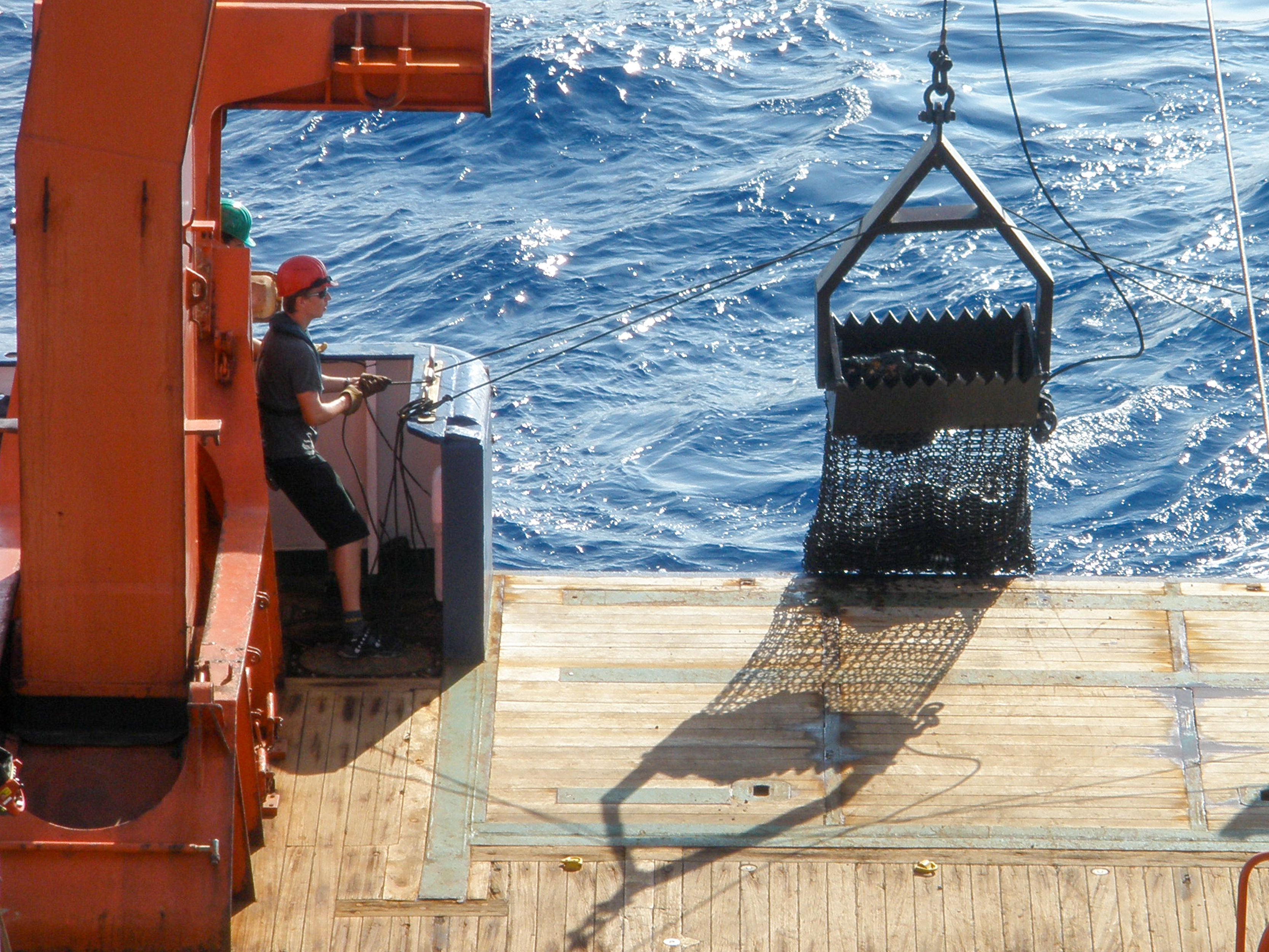 Die Kettensackdredge kommt zurück an Bord: Mit ihr können gezielt Gesteinsproben aus mehreren tausend Metern Wassertiefe genommen werden.