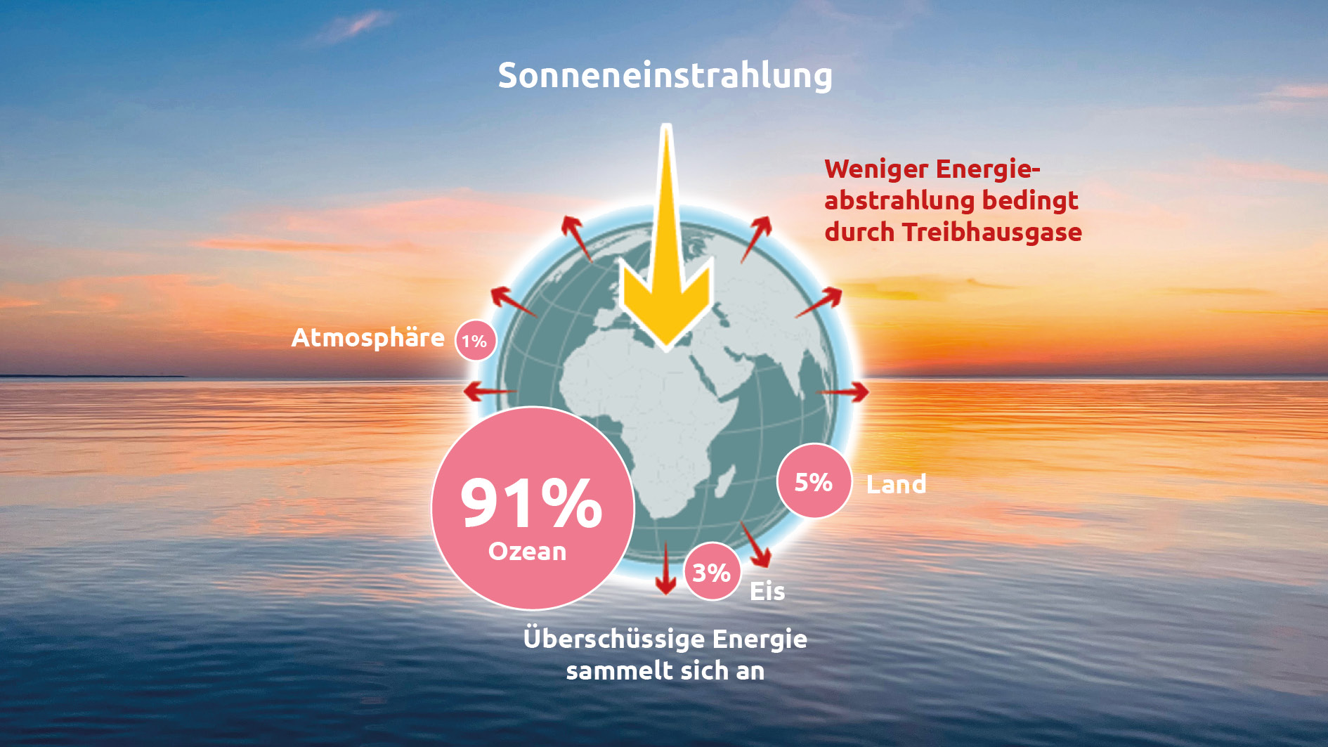 Der Ozean ist der sensibelste Fühler für den fortschreitenden Klimawandel. Rund 90 Prozent der zusätzlichen Energie, die durch den Treibhauseffekt im Erdsystem verbleibt, wird im Ozean gespeichert. Diese Wärmeaufnahme verändert die Meere selbst und beeinflusst Wetter, Meeresströmungen, Meeresspiegel und Ökosysteme weltweit.