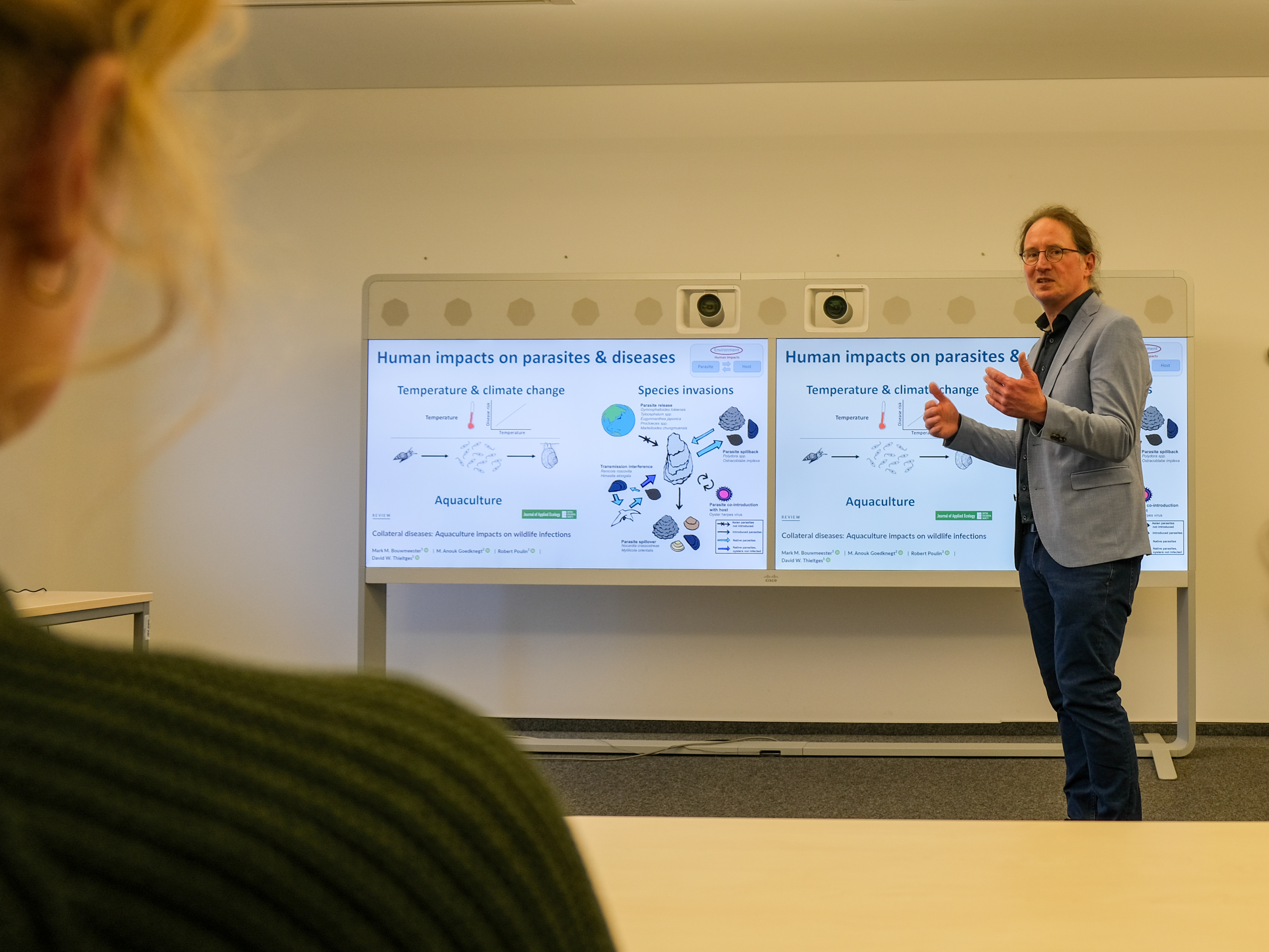 Im Rahmen seiner Exzellenz-Professur sprach Professor Dr. David Thieltges in Kiel mit Studierenden über seinen Werdegang und seine Forschungsarbeit. Foto: Ilka Thomsen/GEOMAR