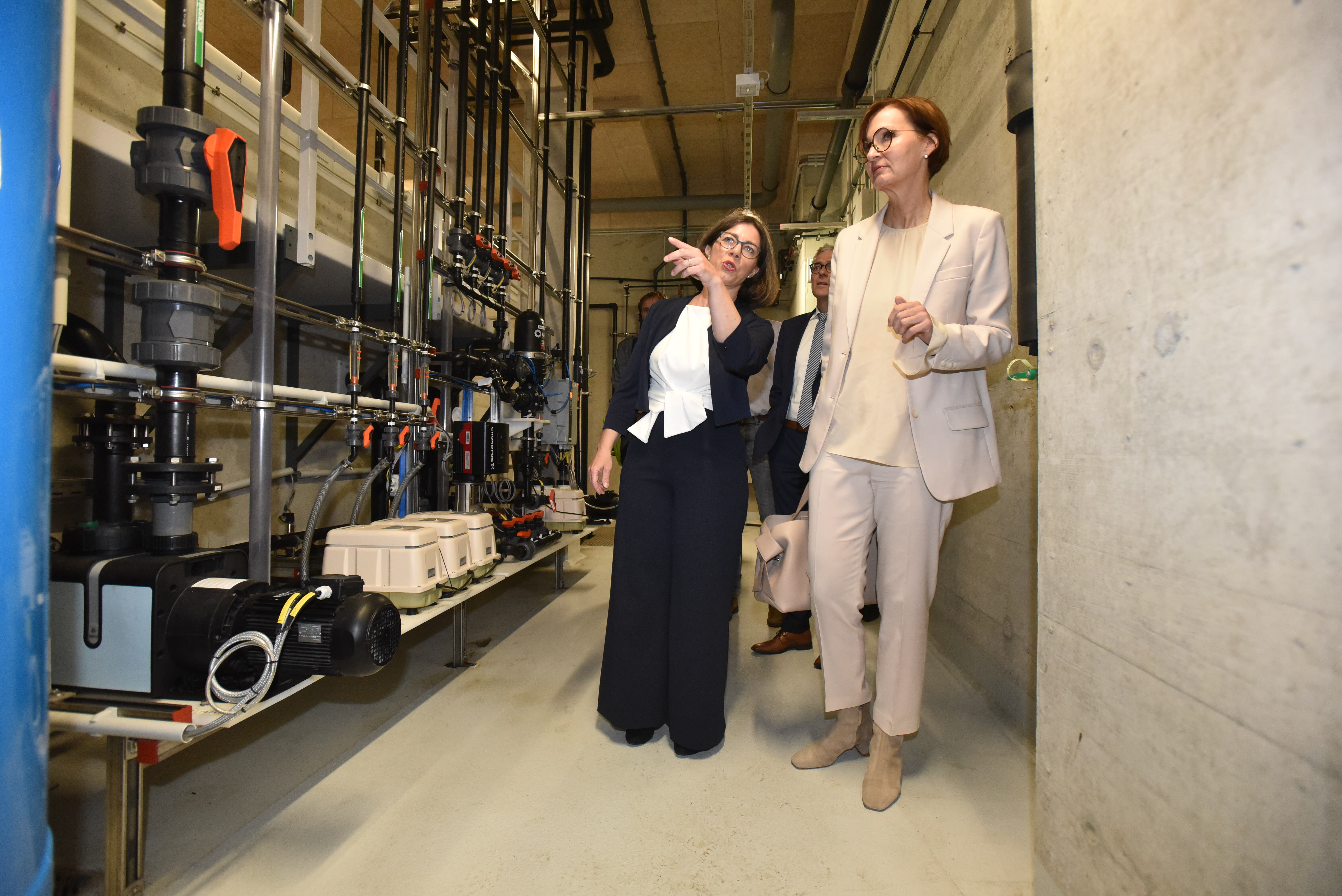 Bundes-Forschungsministerin Bettina Stark-Watzinger (rechts) und GEOMAR-Direktorin Professorin Dr. Katja Matthes beim Blick hinter die Kulissen: Die Seewasserzentrale versorgt die Forschenden für ihre Experimente im GEOMAR-Neubau. Foto: Thomas Eisenkrätzer, GEOMAR