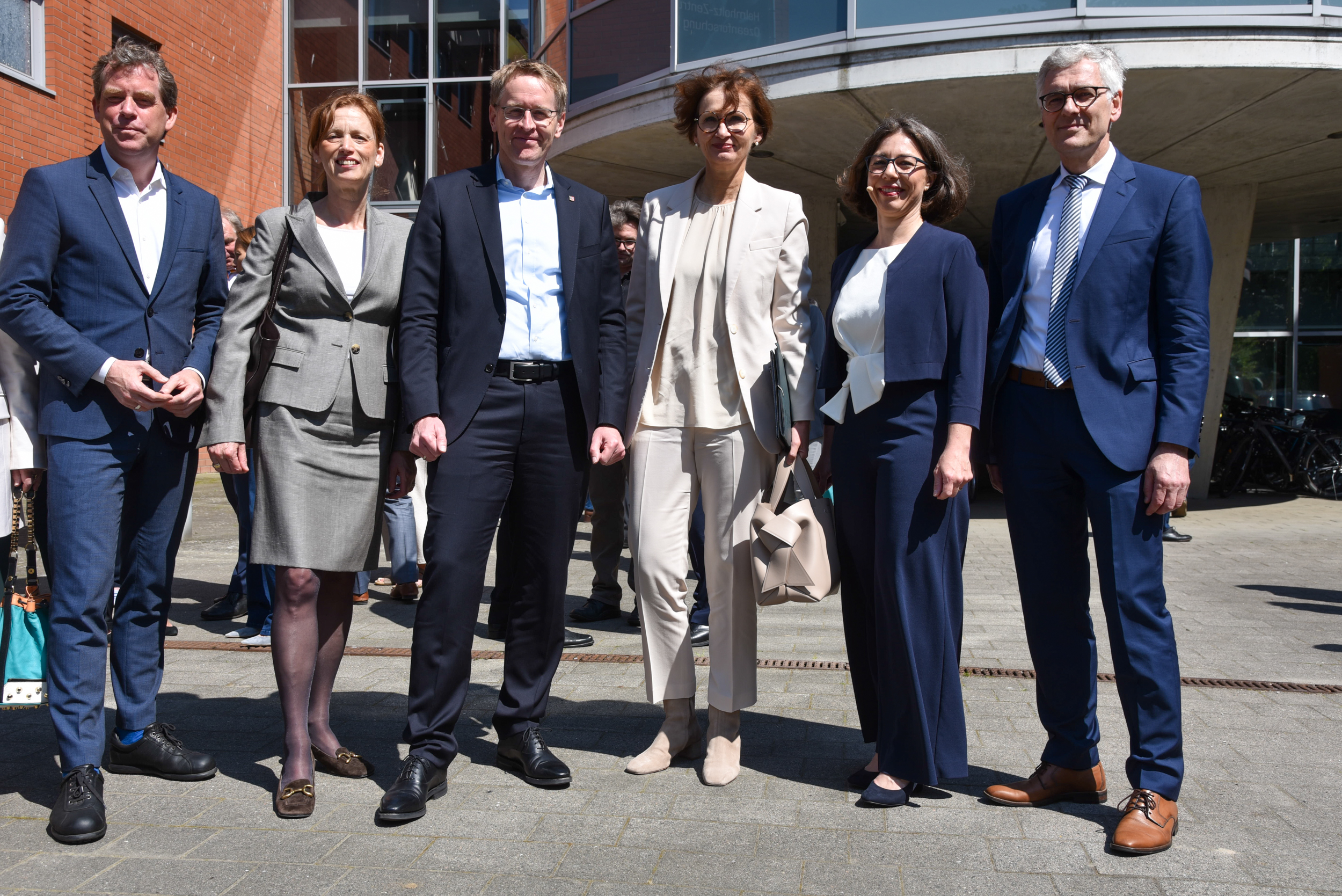 Vor der feierlichen Einweihung des GEOMAR-Neubaus: Dr. Ulf Kämpfer, Oberbürgermeister der Stadt Kiel, Karin Prien, Forschungsministerin des Landes Schleswig-Holstein, Daniel Günther, Ministerpräsident des Landes Schleswig-Holstein, Bettina Stark-Watzinger, Bundesministerin für Bildung und Forschung, Prof. Dr. Katja Matthes, Direktorin des GEOMAR, Frank Spiekermann, Verwaltungsdirektor des GEOMAR (v.l.). Foto: Thomas Eisenkrätzer