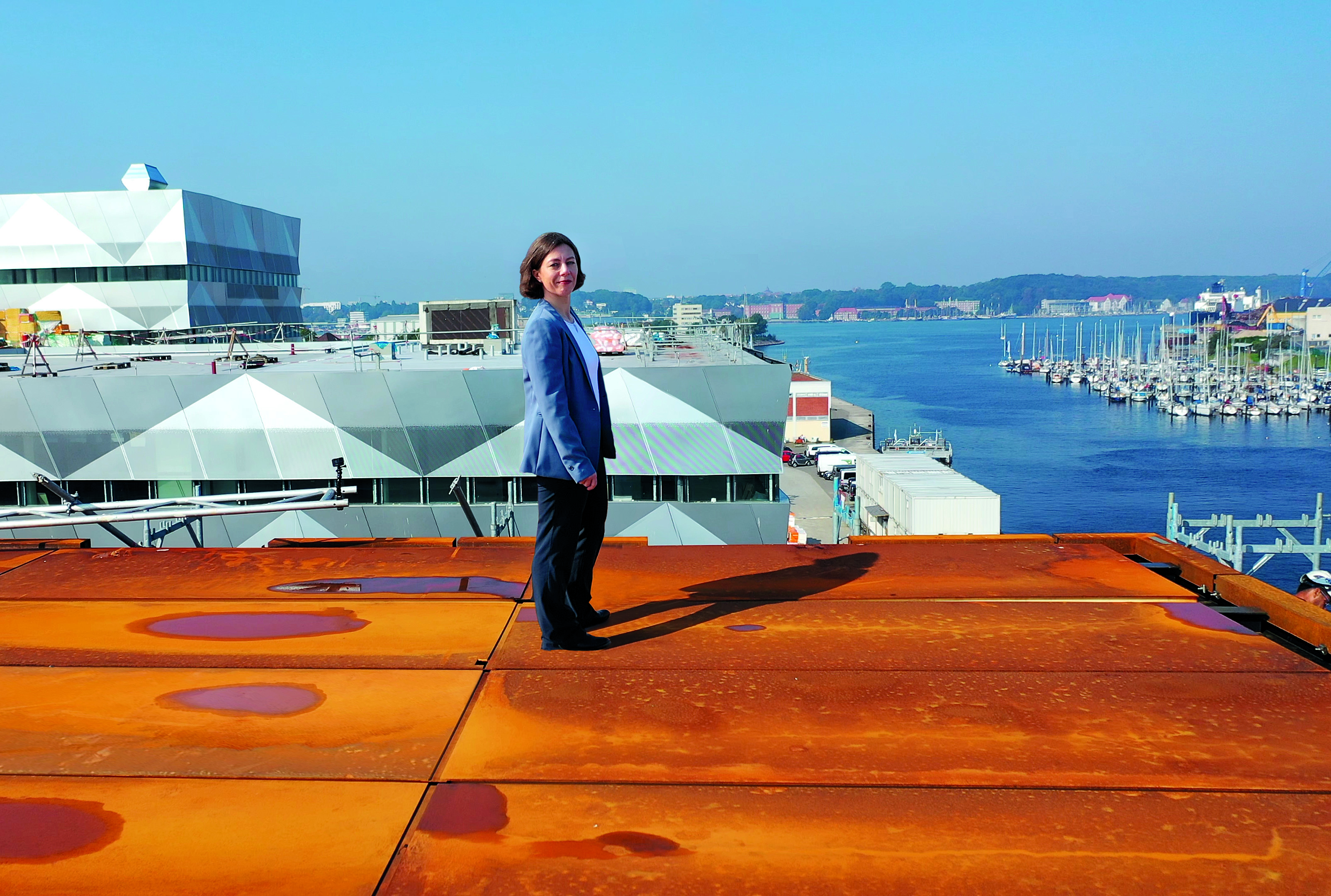 GEOMAR-Direktorin Professorin Dr. Katja Matthes auf dem Dach des Neubaus. Foto: Jens Klimmeck, GEOMAR