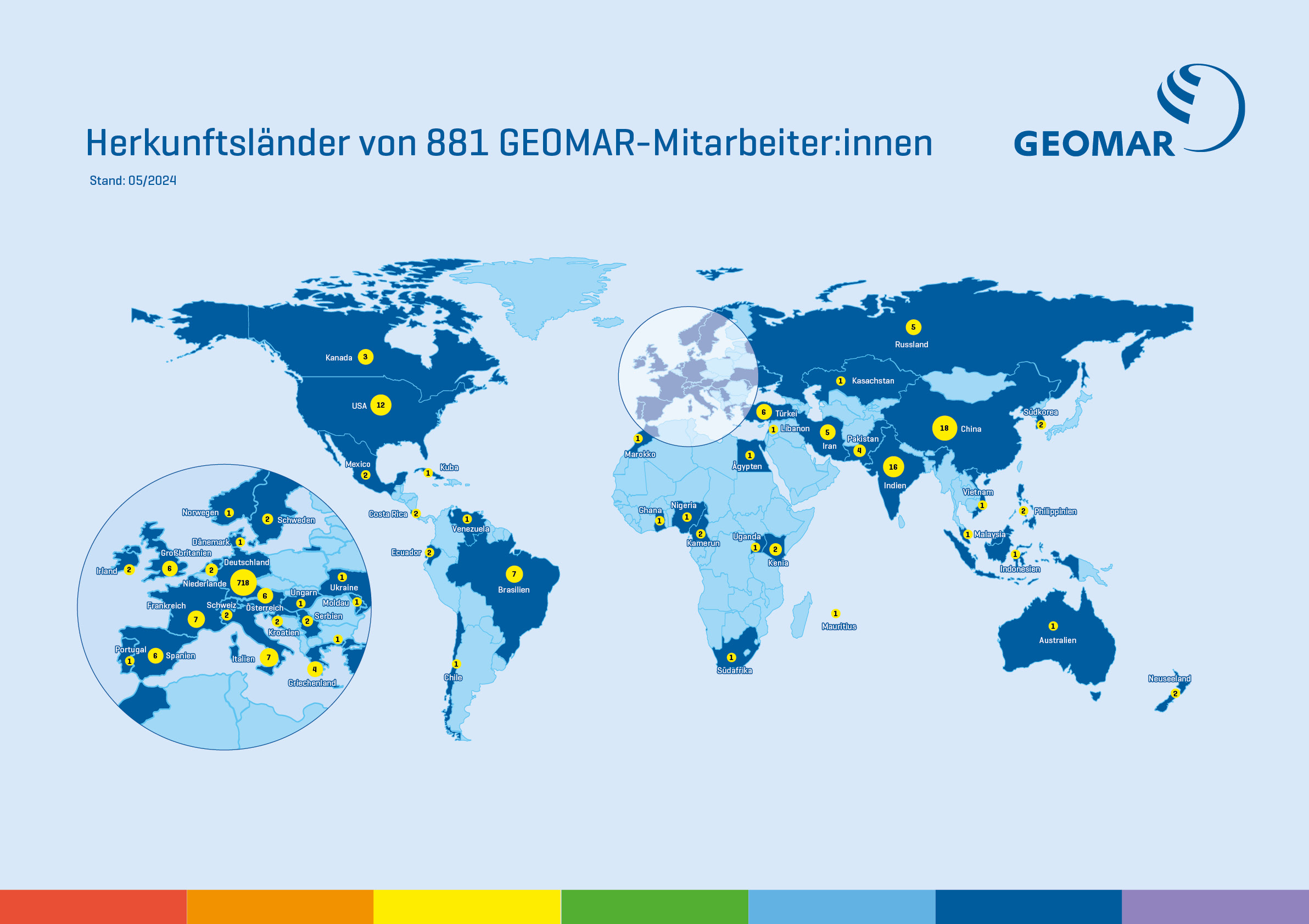 Die Karte zeigt die Vielzahl der Herkunftsländer von 881 GEOMAR-Mitarbeitenden. Grafik: Christoph Kersten