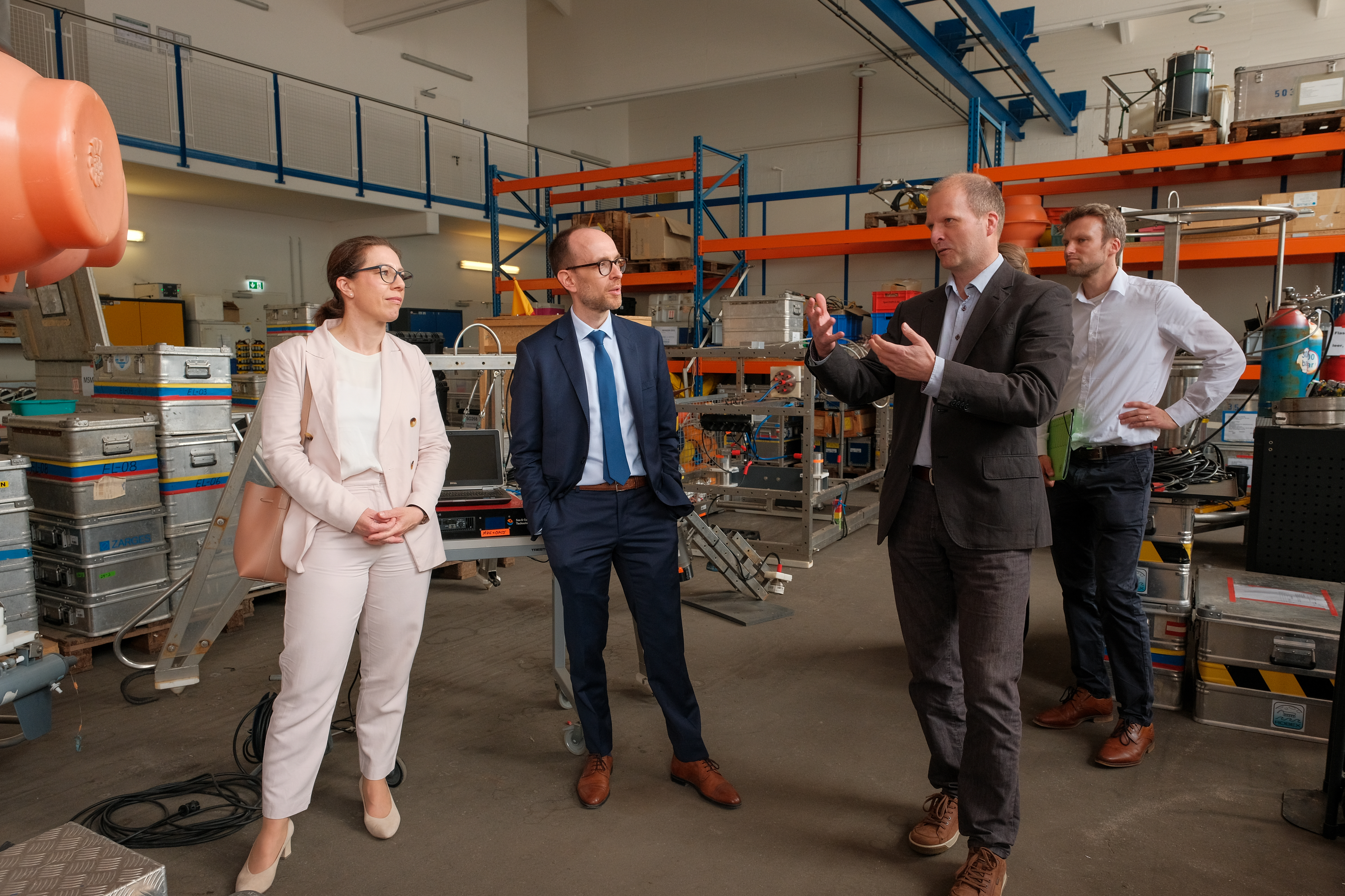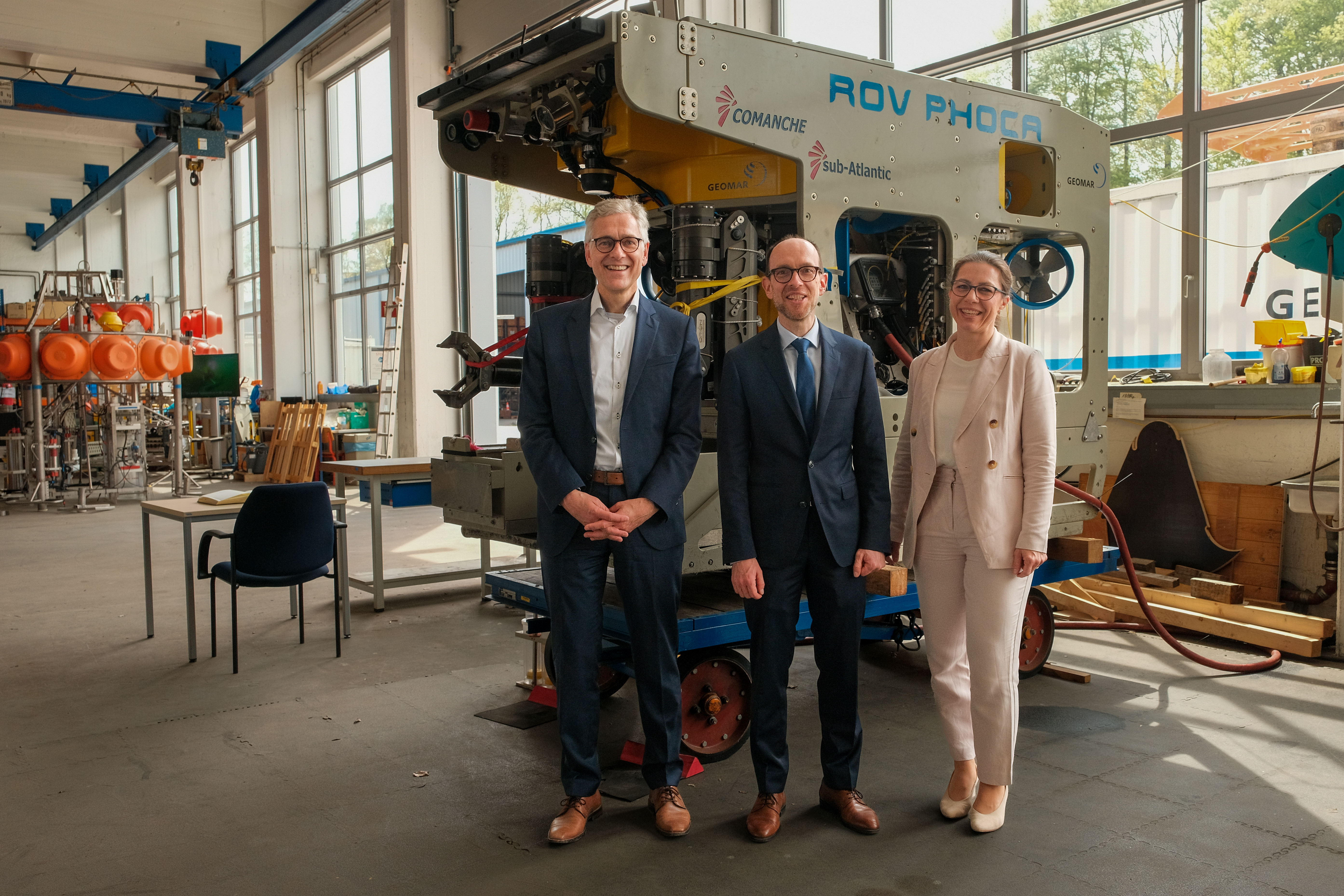 Frank Spiekermann, Verwaltungsdirektor des GEOMAR, Ministerialdirektor Stefan Müller, neuer Vorsitzender des GEOMAR-Kuratoriums und Professorin Dr. Katja Matthes, Direktorin des GEOMAR vor dem ferngesteuerten Tauchroboter ROV PHOCA. Foto: Sarah Kaehlert, GEOMAR
