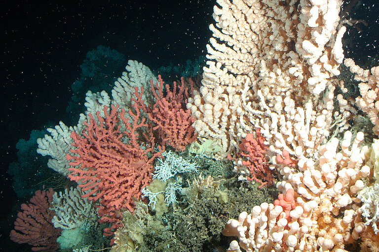 Für ihre Untersuchungen sammelten Meeresbiologinnen und Meeresbiologen des GEOMAR auf einer Expedition mit dem Forschungsschiff POSEIDON und dem Tauchboot JAGO Kaltwasserkorallen im Trondheim-Fjord (Norwegen). „Auf Tauchgängen mit JAGO haben wir einen unmittelbaren Eindruck vom Zustand der Riffe bekommen. Wir haben dessen Ausbreitung und die Lebewelt im Riff dokumentiert und unsere Proben sehr gezielt ausgewählt“, erklärt Janina Büscher. Die Doktorandin aus der Forschungseinheit Biologische Ozeanografie leitete die Experimente und ist Erst-Autorin einer Veröffentlichung zu Auswirkungen von Ozeanversauerung und Erwärmung auf Lophelia pertusa im Fachmagazin Frontiers in Marine Science. „Der Artenreichtum dieser Riffe, die in fast völliger Dunkelheit und bei Temperaturen unter zehn Grad Celsius existieren, ist beeindruckend.“ Viele der über Jahrhunderte gewachsenen untermeerischen Oasen stehen als Naturerbe unter Schutz. Ihr Artenreichtum sichert die Widerstandsfähigkeit des Ökosystems im Fjord, und viele Fischarten finden hier Unterschlupf und Nahrung.
