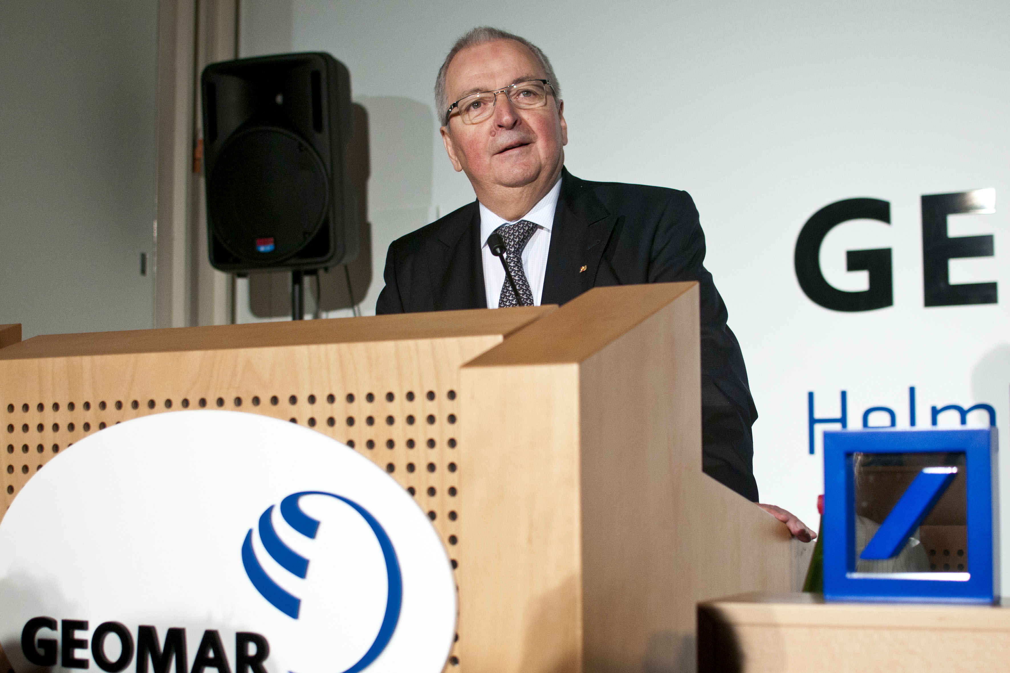 Als Laudator konnte kein geringerer als der ehemalige Bundesumweltminister und langjähriger Direktor des Umweltprogramms der Vereinten Nationen (UNEP), Professor Klaus Töpfer, gewonnen werden, der heute das „Institute for Advanced Sustainabilty Studies (IASS) in Potsdam leitet. „Umweltforschung und partnerschaftliche Entwicklungszusammenarbeit ist eine wegweisende Kombination, die mir sehr am Herzen liegt“, so Professor Töpfer. In seiner Laudatio hob er die richtungsweisende Kooperation zwischen dem GEOMAR und der Republik Kapverden hervor. Basierend auf einer stabilen Demokratie und einem friedlichen Miteinander sei es den verantwortlichen Politikern auf den Kapverden, allen voran José Maria Neves, gelungen, eine fruchtbare wissenschaftliche Kooperation zwischen einheimischen Forschungseinrichtungen wie dem Instituto Nacional de Desenvolvimento das Pescas (INDP) und dem GEOMAR in Kiel zu begründen. „Die Menschen auf den Kapverden haben die Bedeutung des Schutzes und der Erforschung des Meeres vor ihrer Haustüre erkannt und geben in der Kooperation mit Meeresforschern ein vorbildliches Beispiel ab“, meint Klaus Töpfer. Und sie profitieren durch die vermehrten Forschungsaktivitäten nicht nur in wirtschaftlicher Hinsicht, sondern gewinnen dadurch auch ein Mehr an Bildung und Forschung. Professor Töpfer lobt in diesem Zusammenhang ebenso die fruchtbare Zusammenarbeit von Schülern in Kiel und Mindelo sowie die gemeinsame Arbeit im Bereich der wissenschaftlichen Weiterbildung.
