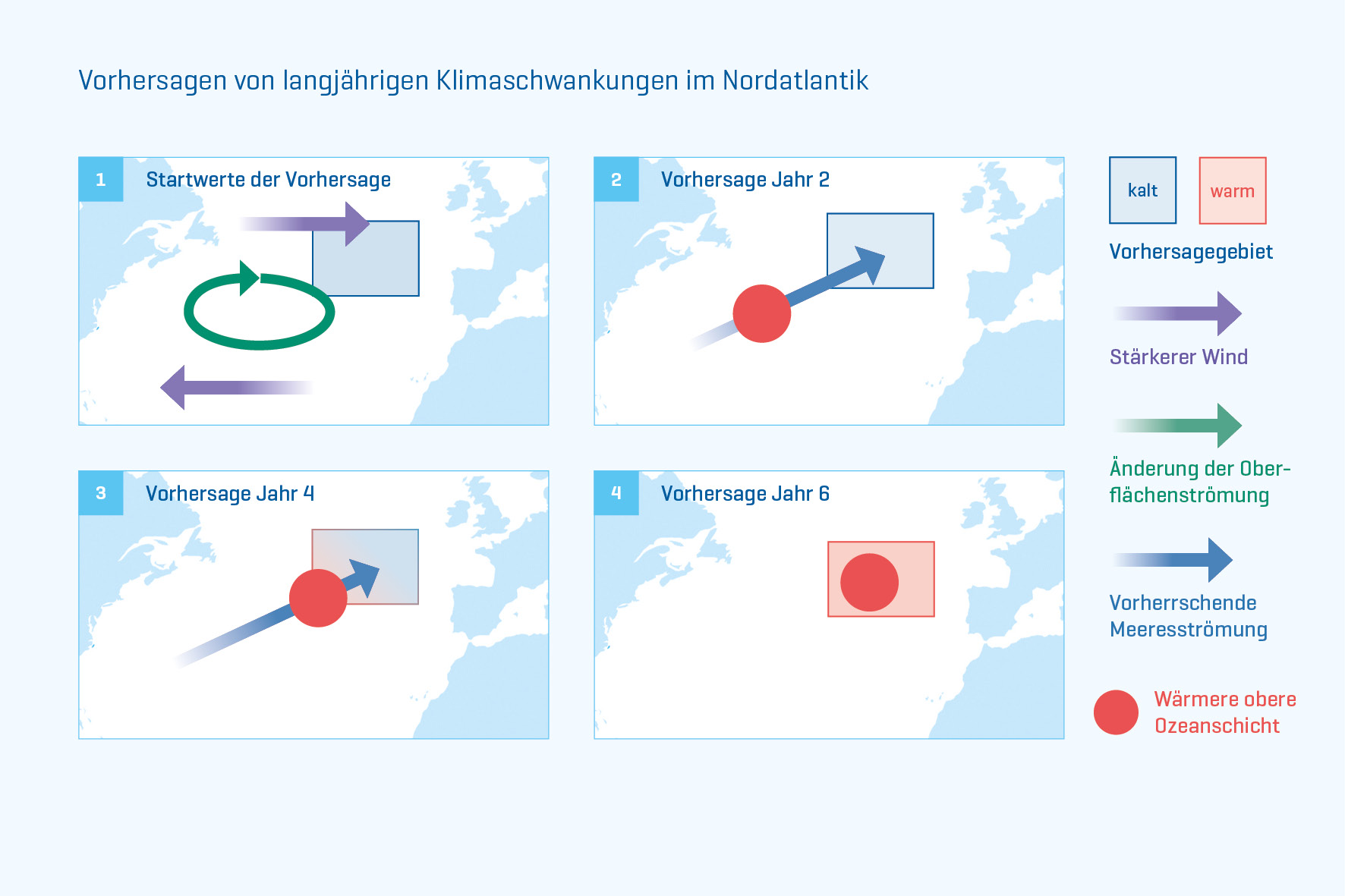 Sind solche Vorhersagen überhaupt möglich? Was braucht man dafür und welche Aussagen liefern solche Vorhersagen? Diesen Fragen sind die Wissenschaftlerinnen und Wissenschaftler vom GEOMAR und dem Institut für Ostseeforschung in Warnemünde nachgegangen. „Ja, Langzeitprognosen sind möglich. Das verdanken wir den langsamen, über mehrere Jahre schwankenden Ozeanprozessen“, erläutert Dr. Reintges. Die Schwierigkeit ist, dass man möglichst realistische Ozeanbeobachtungen für den Start der Modellrechnungen benötigt. Diese sind aber in Menge und Qualität insbesondere unterhalb der Meeresoberfläche sehr begrenzt, sagt Reintges.