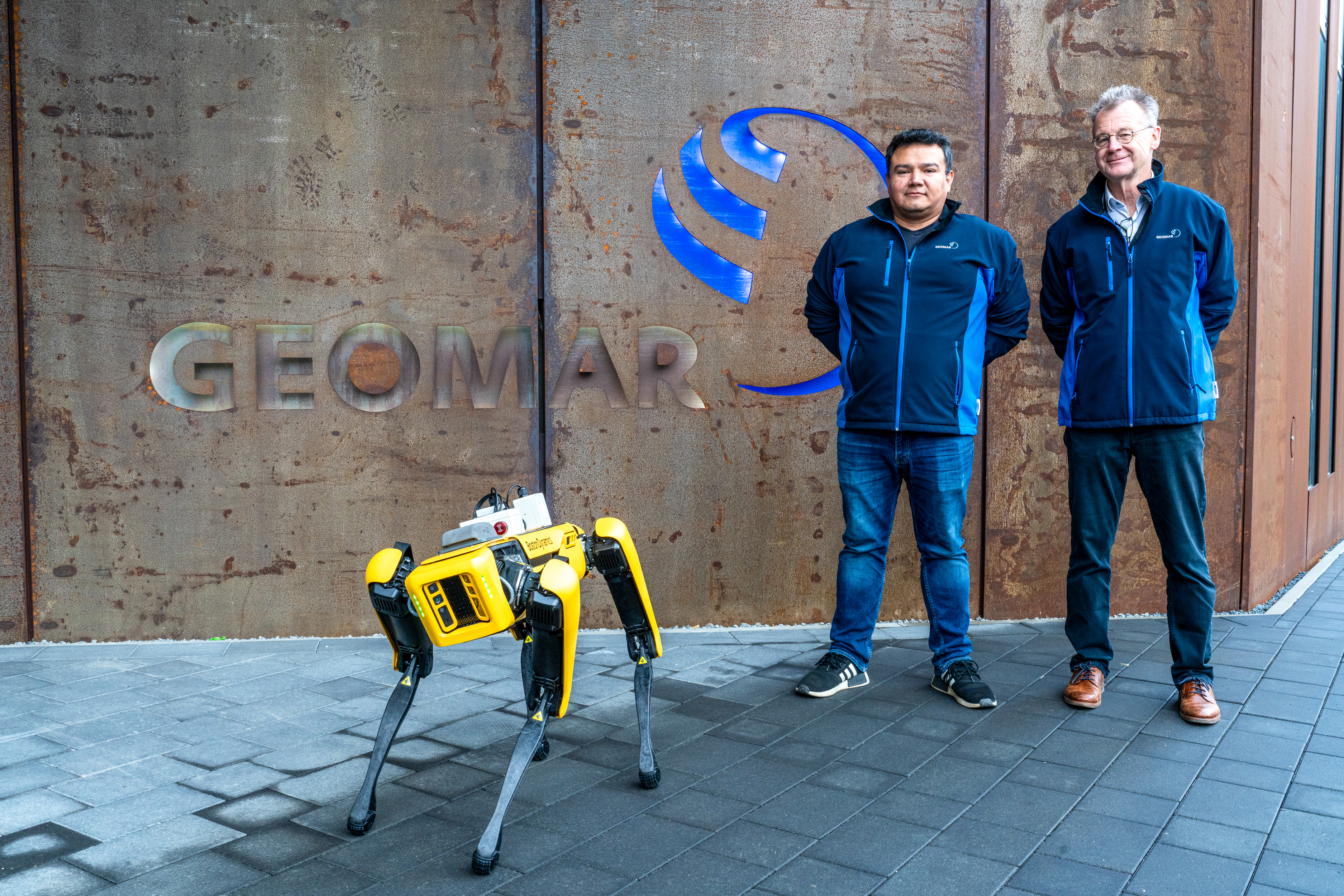 Der Roboterhund SPOT ist mit einem hochempfindlichen Multigas-Sensor ausgerüstet, den Roberto Benavides (l.) ursprünglich für Unterwasseranwendungen entwickelt hat. Initiiert hat das Projekt SPOT-KI Warner Brückmann (r.), der die Idee hatte, Robotik, Sensorik und KI für Sicherheitsanwendungen zu verknüpfen. Foto: Sarah Kaehlert/GEOMAR