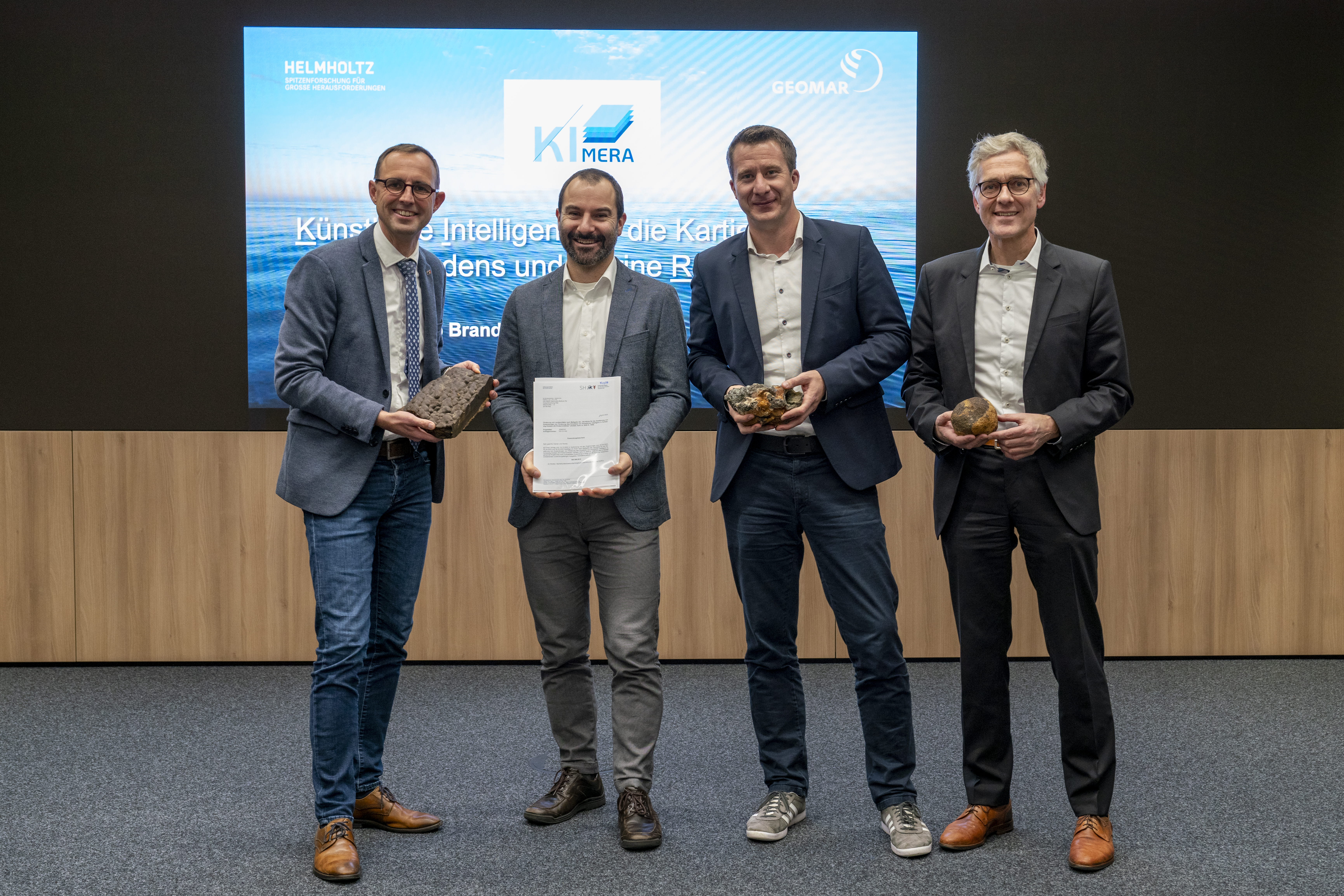 Für das Projekt KIMERA überreichte Digitalisierungsminister Dirk Schrödter einen Förderbescheid in Höhe von 683.000 Euro an Projektleiter Dr. Philipp Brandl vom GEOMAR und Jann Wendt vom Kieler Geodatenspezialisten north.io GmbH. GEOMAR-Verwaltungsdirektor Frank Spiekermann gratulierte (v.l.). Foto: Sarah Kaehlert/GEOMAR