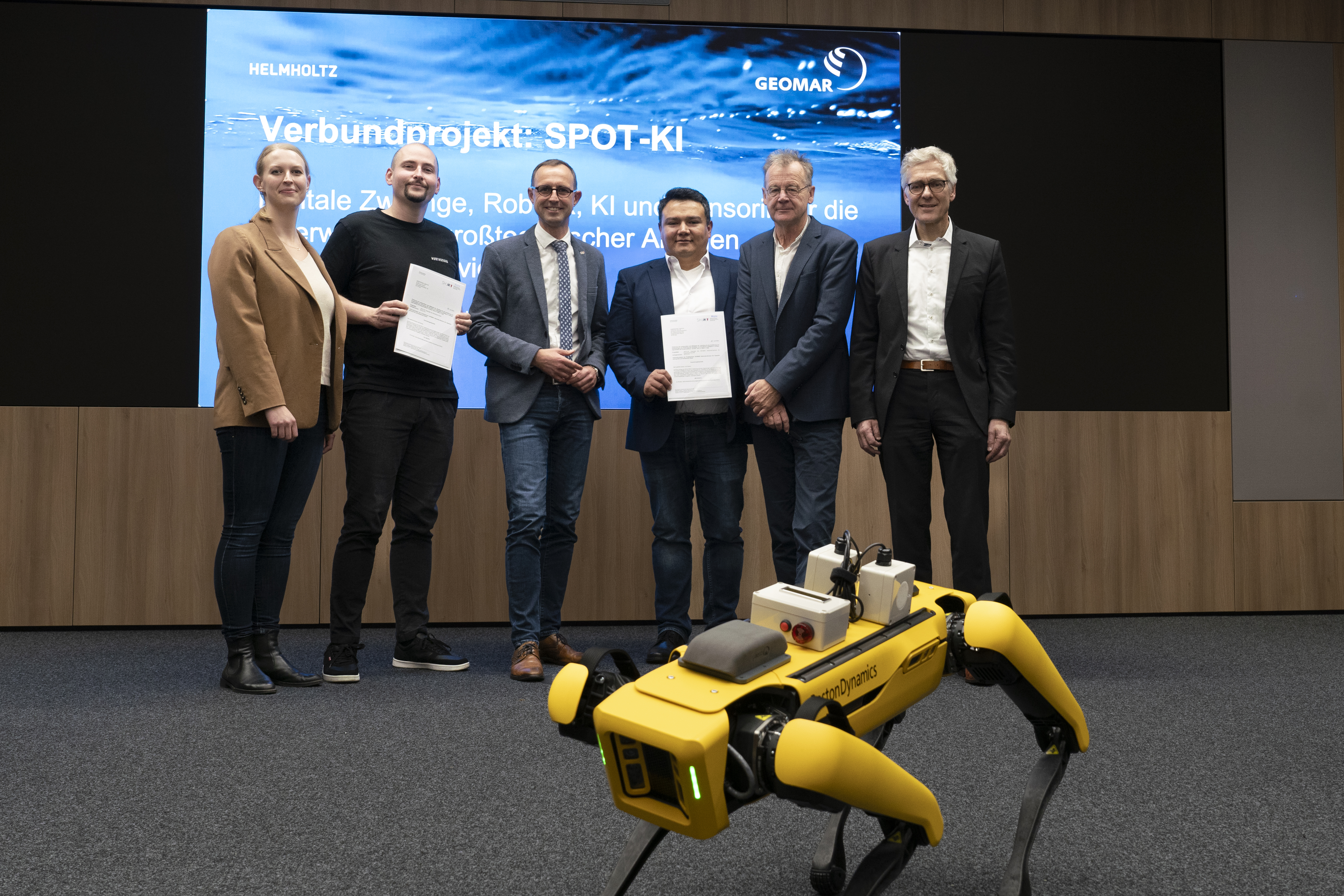 Digitalisierungsminister Dirk Schrödter (3.v.l.) übergab einen Förderbescheid in Höhe von 610.000 Euro für das Projekt SPOT-KI. GEOMAR-Verwaltungsdirektor Frank Spiekermann (r.) freut sich mit Dr. Warner Brückmann und Roberto Benavides vom GEOMAR sowie Joachim Perschbacher und Julia Barenthien von der Northdocks GmbH (v.r.n.l.). Foto: Sarah Kaehlert