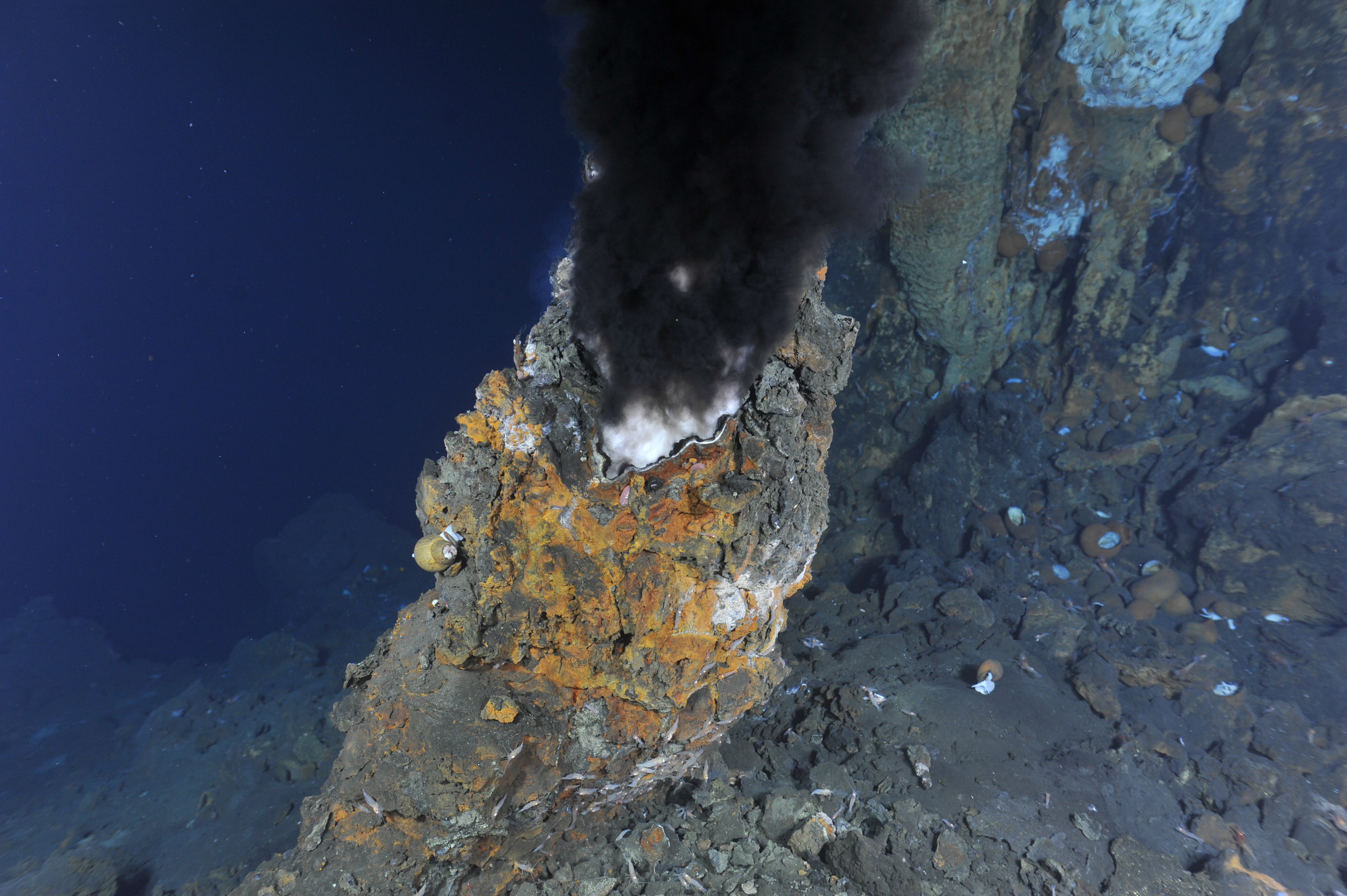 Schwarze Raucher wie dieser am Vulkan Niua im so genannten Lau Becken im Westpazifik bieten einzigartige Lebensräume. Diese sind noch weitgehend unerforscht, dennoch machen wirtschaftliche Interessen menschliche Eingriffe in der Tiefsee in der Zukunft erwartbar. Das Projekt KIMERA wird künstliche Intelligenz nutzen, um Tiefseeboden automatisch zu klassifizieren und Entscheidungsgrundlagen für die Ausweisung von Schutz- und Lizenzgebieten bereitzustellen. Foto: ROV-Team/ROPOS