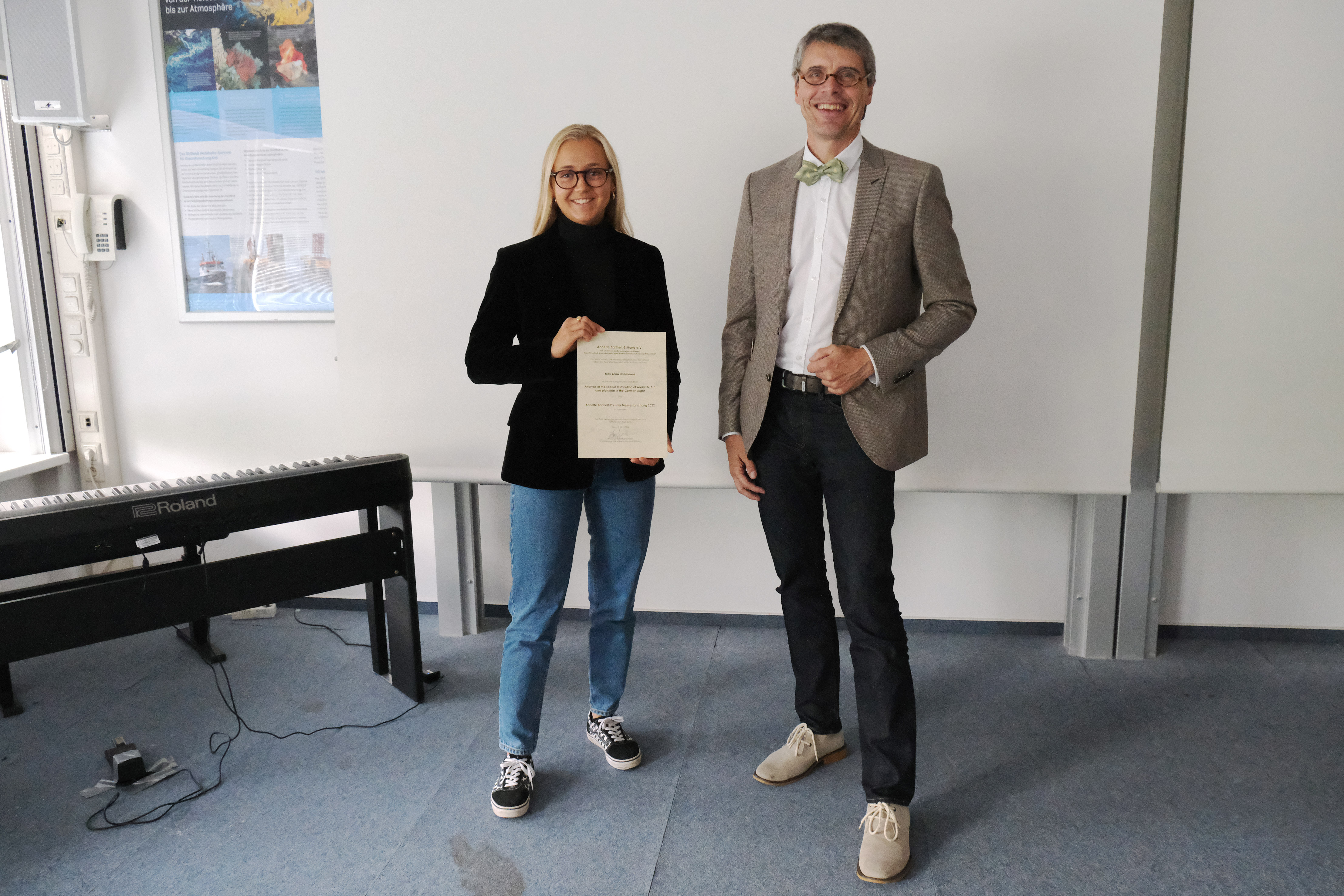 Lena Holtmanns mit ihrer Masterarbeit zur räumlichen Verteilung von vier Seevogelarten im Juni 2019 in der Deutschen Bucht (Nordsee). Der Titel lautet „Analysis of the spatial distribution of seabirds, fish and plankton in the German Bight” (Analyse der räumlichen Verteilung von Seevögeln, Fischen und Plankton in der Deutschen Bucht). In der Arbeit wurde der Einfluss von verschiedenen Variablen, wie zum Beispiel Wassertemperatur, Salzgehalt, Fisch- oder Zooplanktonvorkommen, auf die Seevogelverteilung untersucht. Sie wurde unter der Betreuung von Dr. Jens Floeter am Fachbereich Biologie der Universität Hamburg angefertigt. Es fand zudem eine Zusammenarbeit mit dem Zweitprüfer Dr. Kai Borkenhagen vom Forschungs- und Technologiezentrum (FTZ) der Universität Kiel statt.