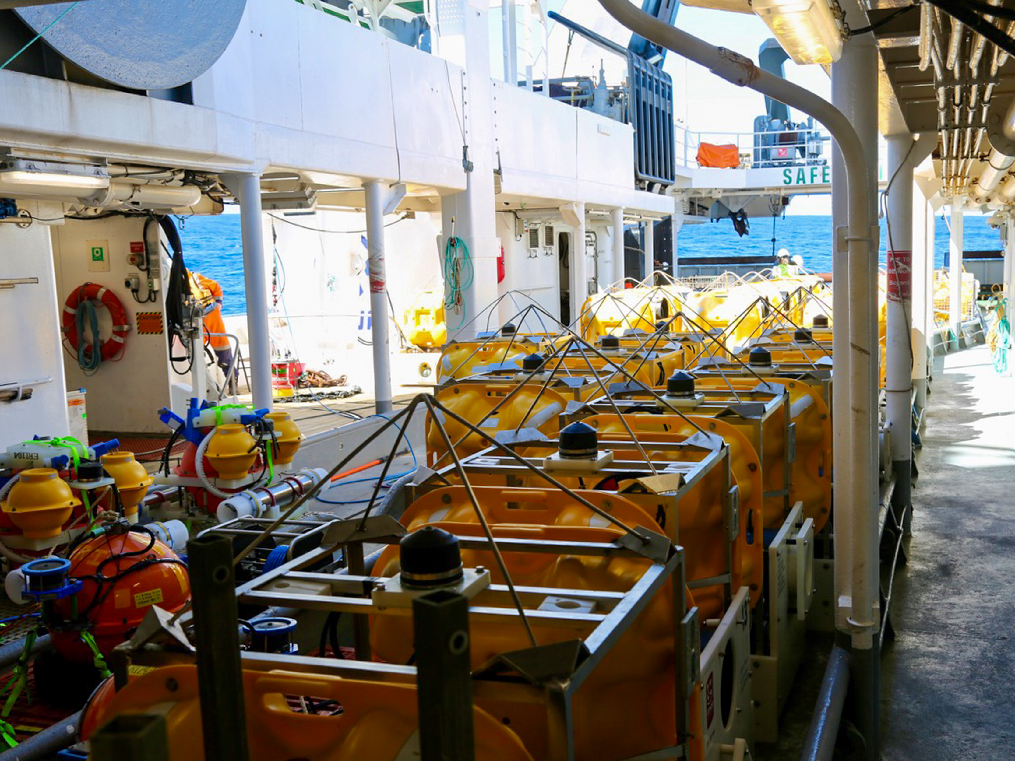 Ozeanboden-Seismometer an Bord der TANGAROA: Mit dem neuseeländischen Forschungsschiff sind die Messgeräte nach ihrem Einsatz während der dreijährigen Messkampagne wieder geborgen worden - ein wichtiger Meilenstein, um durch Subduktionszonen verursachte Erdbeben- und Tsunamirisiken besser zu verstehen.
