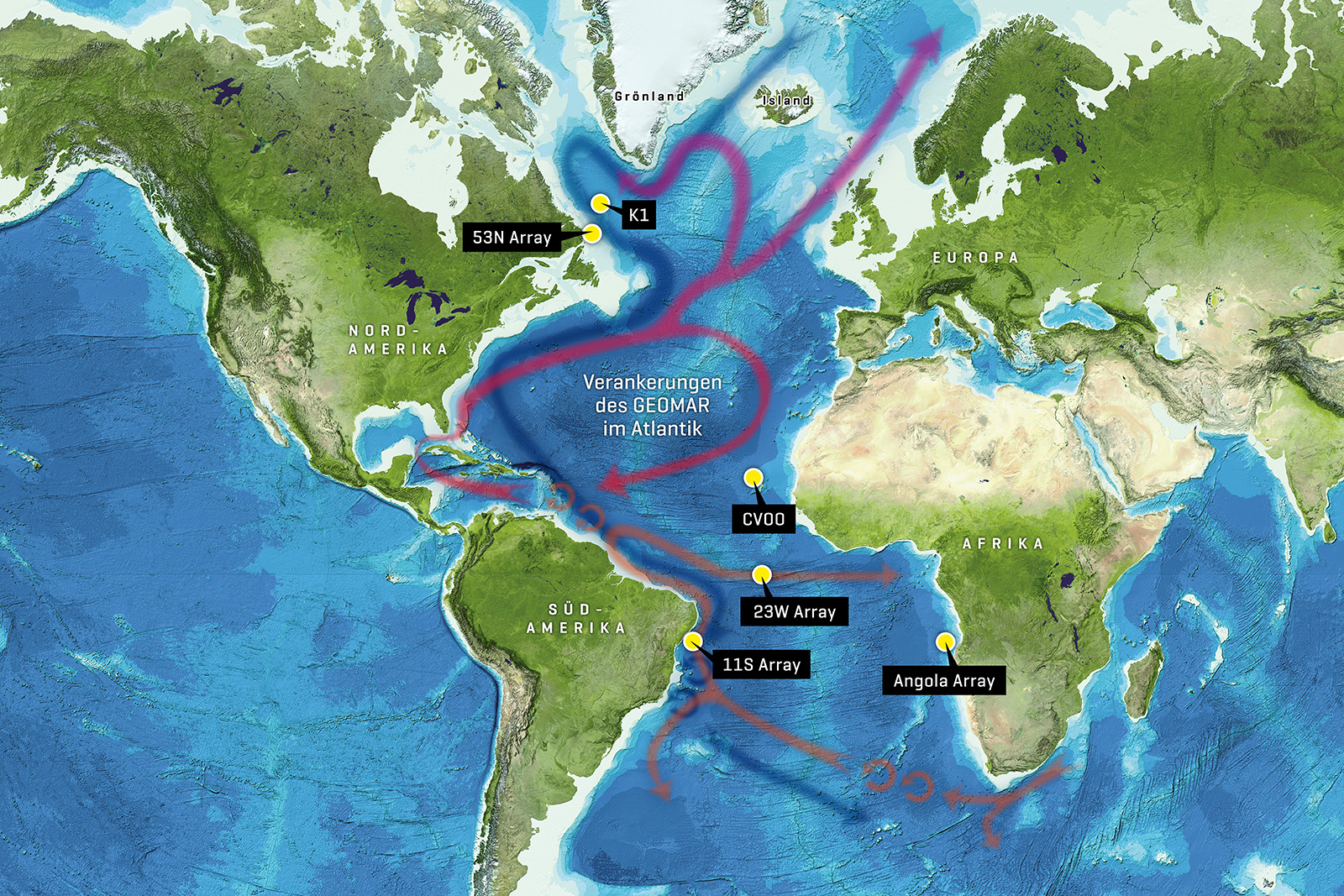 Karte der vom GEOMAR betreuten ozeanographischen Verankerungen im Atlantik mit eingezeichneten Strömungen von warmen Oberflächenwasser und kaltem Tiefenwasser der Atlantischen Umwälzzirkulation (AMOC). Während der Expedition M142 werden die Verankerungen 53°N-Observatorium und K1 gewartet.