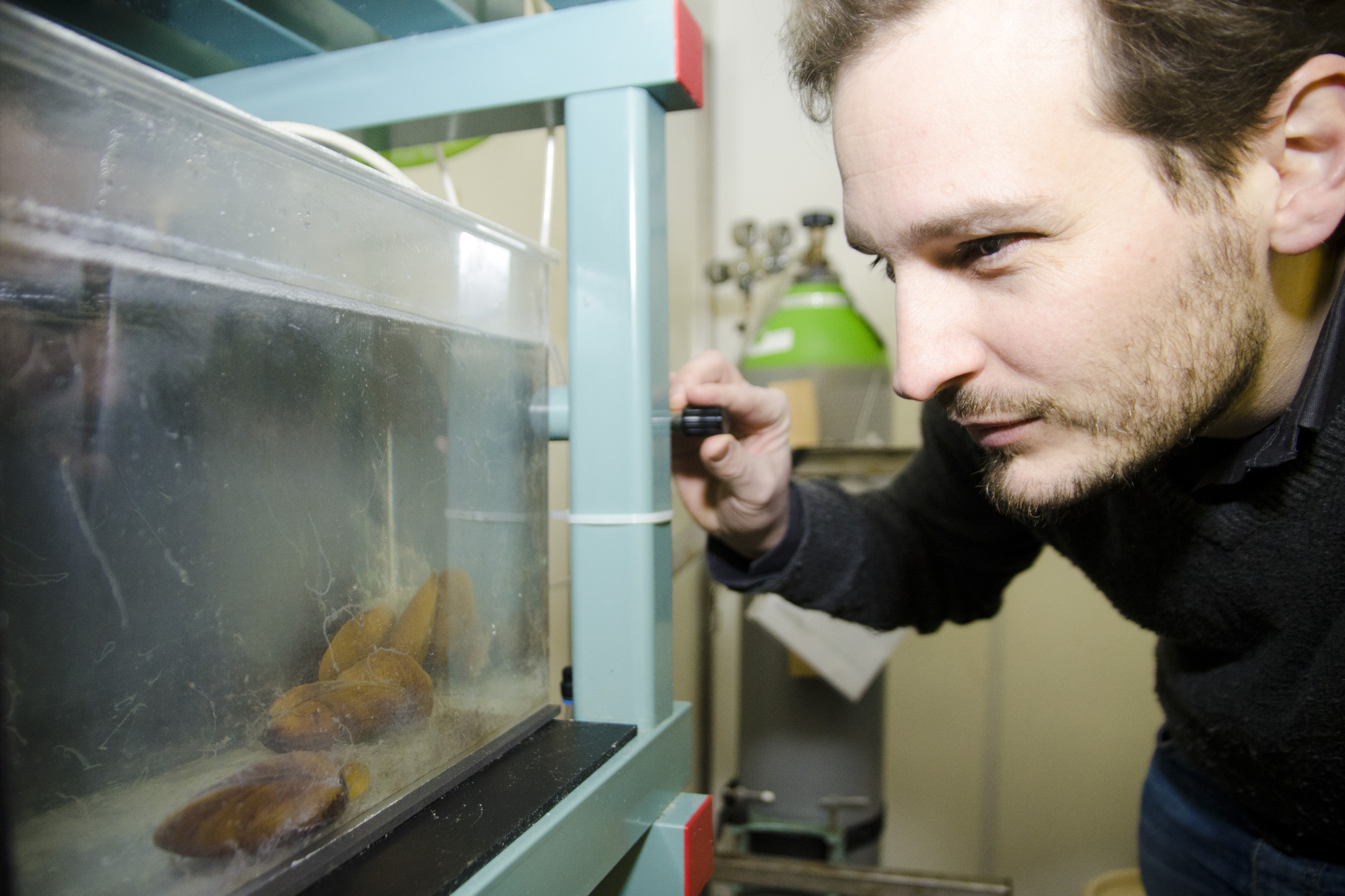Ihre Forschungsobjekte wurden während einer Ausfahrt des französischen Forschungsschiffs POURQOI PAS? im Sommer 2013 mit dem Tiefseeroboter ROV VICTOR 6000 von einem 850 Meter tief gelegenen hydrothermalen Schlot in der Nähe der Azoren im Atlantik gesammelt. Das Halten der Tiefseemuscheln stellt für die Wissenschaftler eine große Herausforderung dar: Um die lichtscheuen Tiere bzw. deren Symbionten ausreichend mit dem für sie lebenswichtigen Schwefelwasserstoff und Methan zu versorgen, haben die Forscher eine kontinuierliche „Fütterung“ mit Natriumsulfid und einem Luft-Methangemisch installiert. Nicht ganz einfach. „Da sowohl Schwefelwasserstoff als auch Methan in entsprechenden Konzentrationen giftig und brennbar sind, mussten einige Sicherheitsaspekte bedacht werden. Aber genau solche Herausforderungen bei der Kultur von Meerestieren in der Forschung zu bewältigen, ist unser Ziel“, erläutert Dr. Claas Hiebenthal, Leiter des KIMOCC.