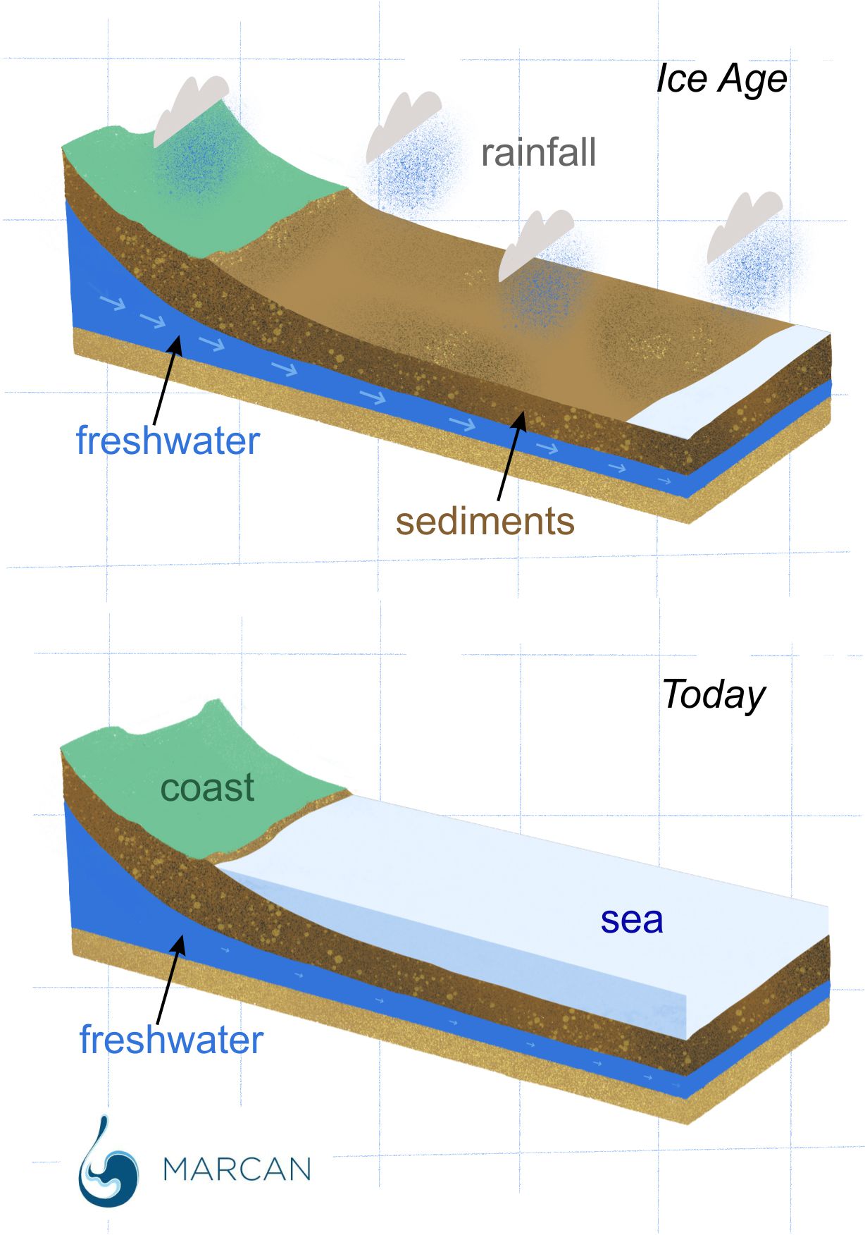 Das Süßwasser stammt aus Niederschlägen und wird derzeit teilweise durch den Grundwasserfluss von der Küstenlinie wieder aufgefüllt. Der Großteil des Süßwassers wurde jedoch während der letzten drei Eiszeiten, als der Meeresspiegel mehr als hundert Meter niedriger war als heute, in dem Reservoir vor der Küste gespeichert.