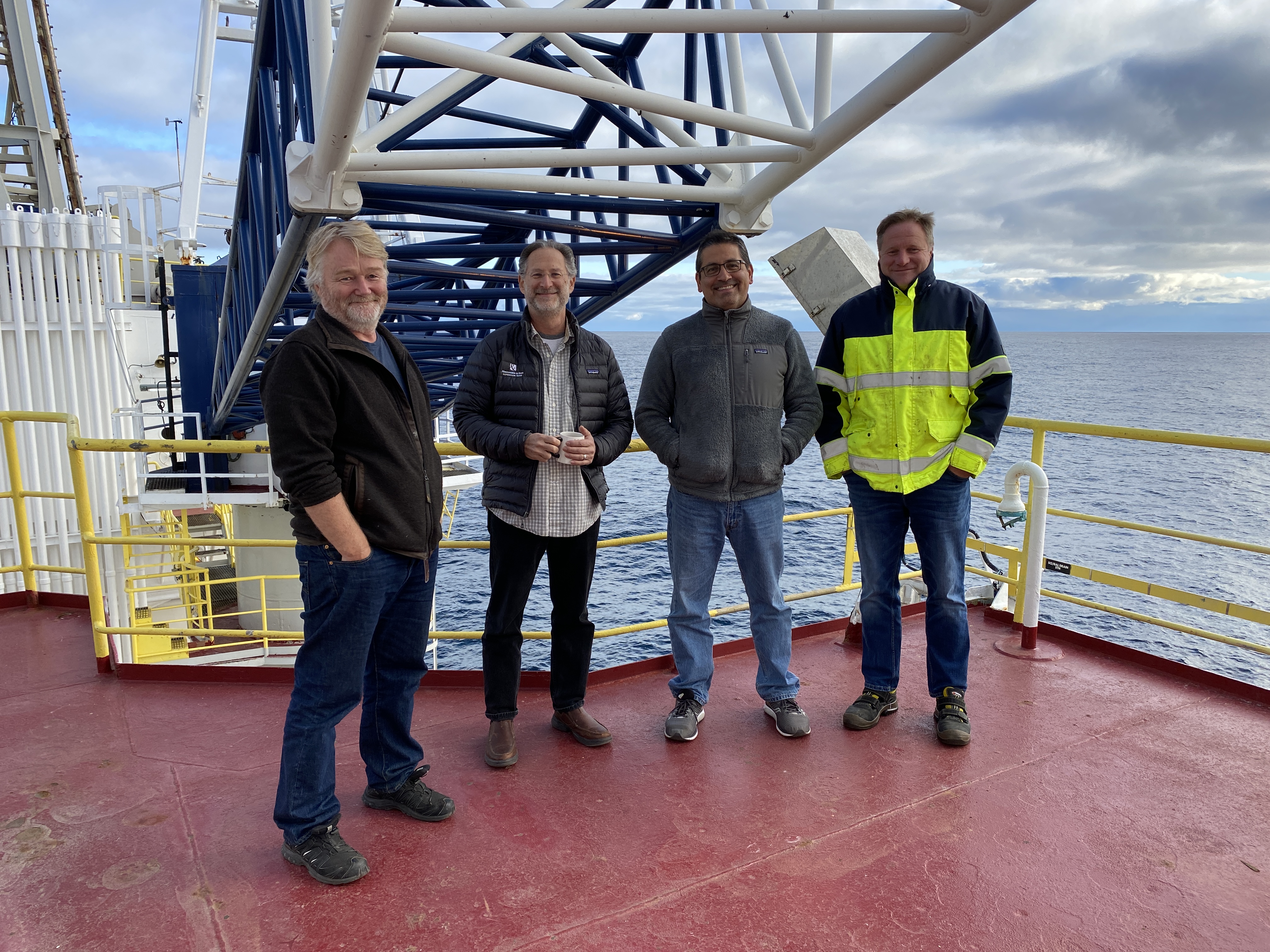An Deck der "JOIDES Resolution": Die beiden Fahrtleiter, Professor Dr. Sverre Planke von der Universität Oslo (links) und Professor Dr. Christian Berndt vom GEOMAR (rechts) mit den Wissenschaftlern Carlos Alvarez Zarikian vom IODP (2. von rechts) und Reed Scherer von der Northern Illinois University (2. von links). Foto: Sayantani Chatterjee (IODP)