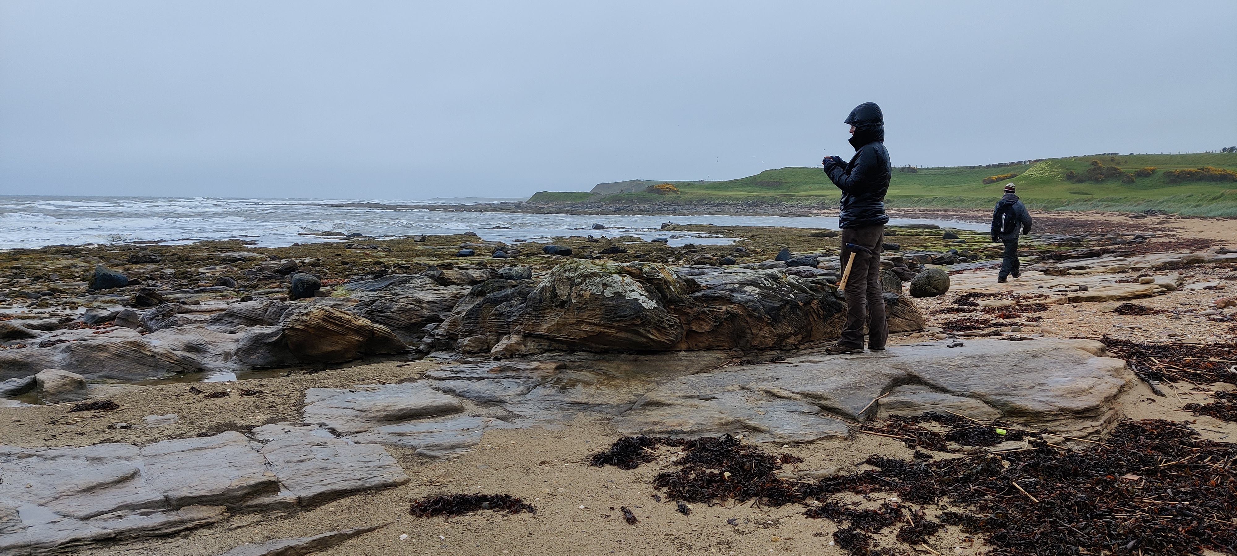 Feldarbeiten in Schottland. Im Karbongestein entlang der südöstlichen Küste Schottlands sind Fossilien aus der späten Eiszeit des Paläozoikums erhalten. Foto: Hana Jurikova, University of St. Andrews