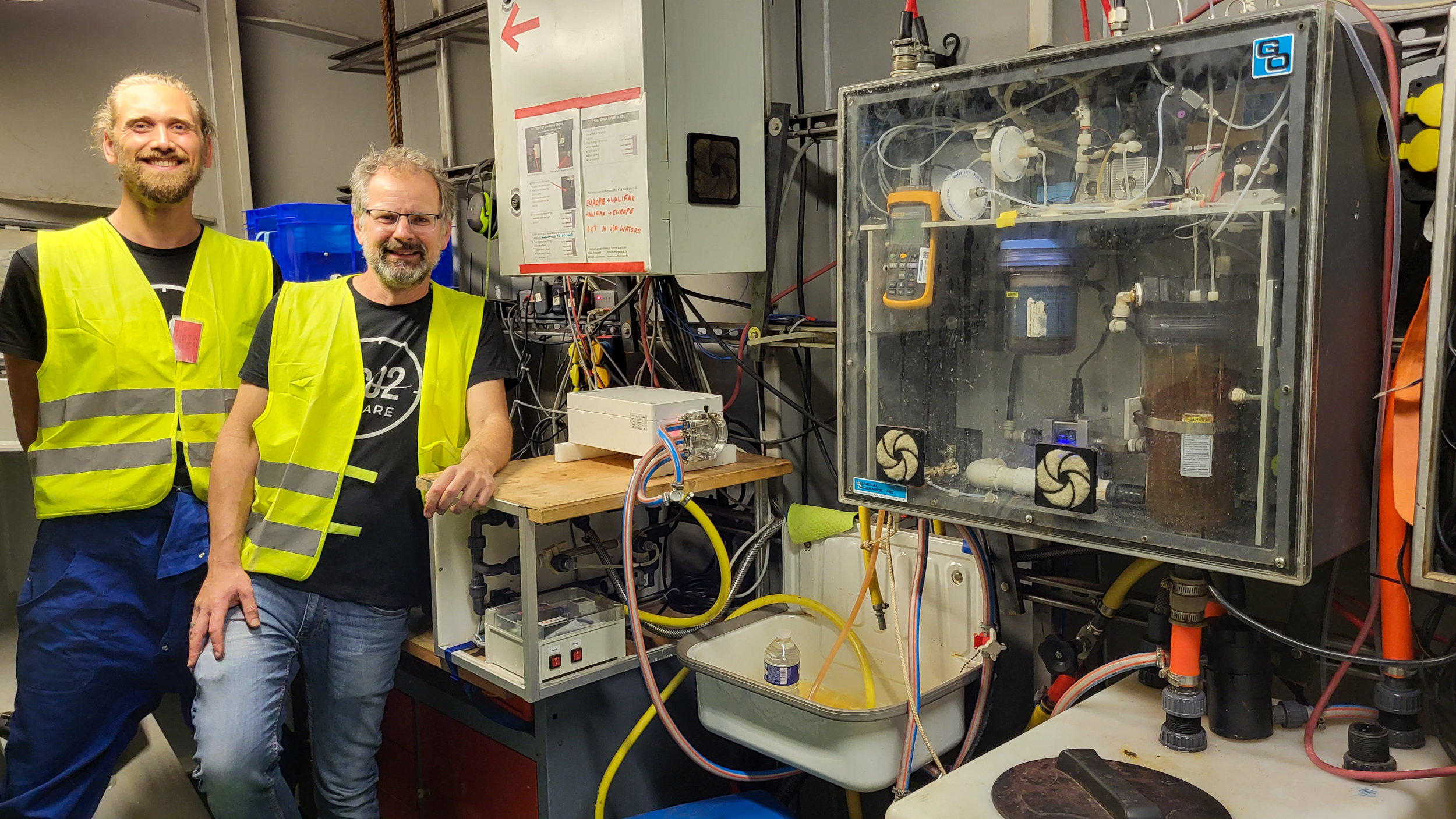 Dr. Tobias Steinhoff (rechts) und Melf Paulsen vor den Messgeräten im Maschinenraum der MS ATLANTIC SAIL: Mit seinen Messungen trägt das GEOMAR regelmäßig zu den Ozeandaten des Global Carbon Budget Berichts bei. Foto: GEOMAR