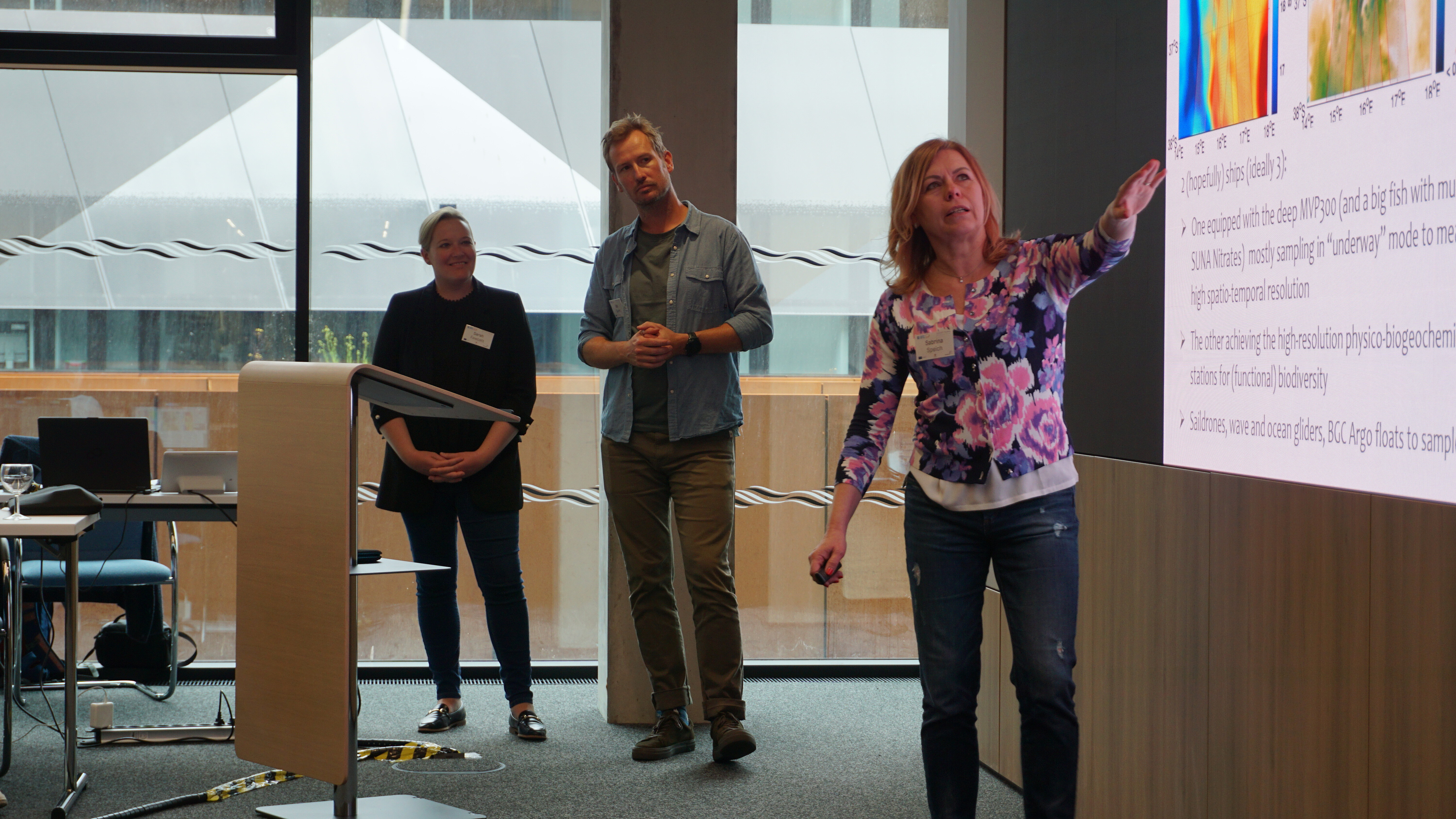 Die führenden Wisesnschaftler:innen Sarah Fawcett, Seb Swart und Sabrina Speich (von links nach rechts) präsentieren im Rahmen der Auftaktveranstaltung zum interdisziplinären ERC-Synergy Grant Project WHIRLS. Foto: Markus Scheinert, GEOMAR