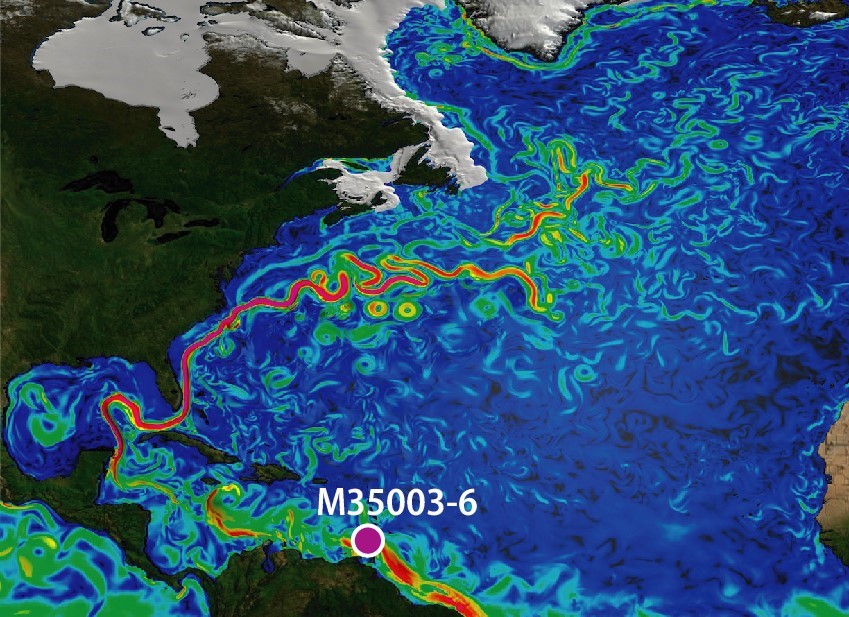 Modellsimulation der Oberflächenströmungsgeschwindigkeit im Atlantik mit Darstellung des Golfstroms und der Position des untersuchten karibischen Sedimentkerns. Die neue Studie bestätigt, dass Salztransport in Süd-Nord-Richtung durch nordatlantische Strömungen ein entscheidender Rückkopplungsmechanismus für die Klimaregulierung ist. Simulation: GEOMAR