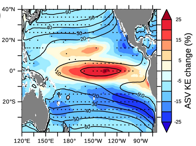 Das Modell zeigt zukünftige Änderungen der kinetischen Energie im pazifischen Becken im Zusammenhang mit der synoptischen Variabilität. Illustration: Duteil & Park