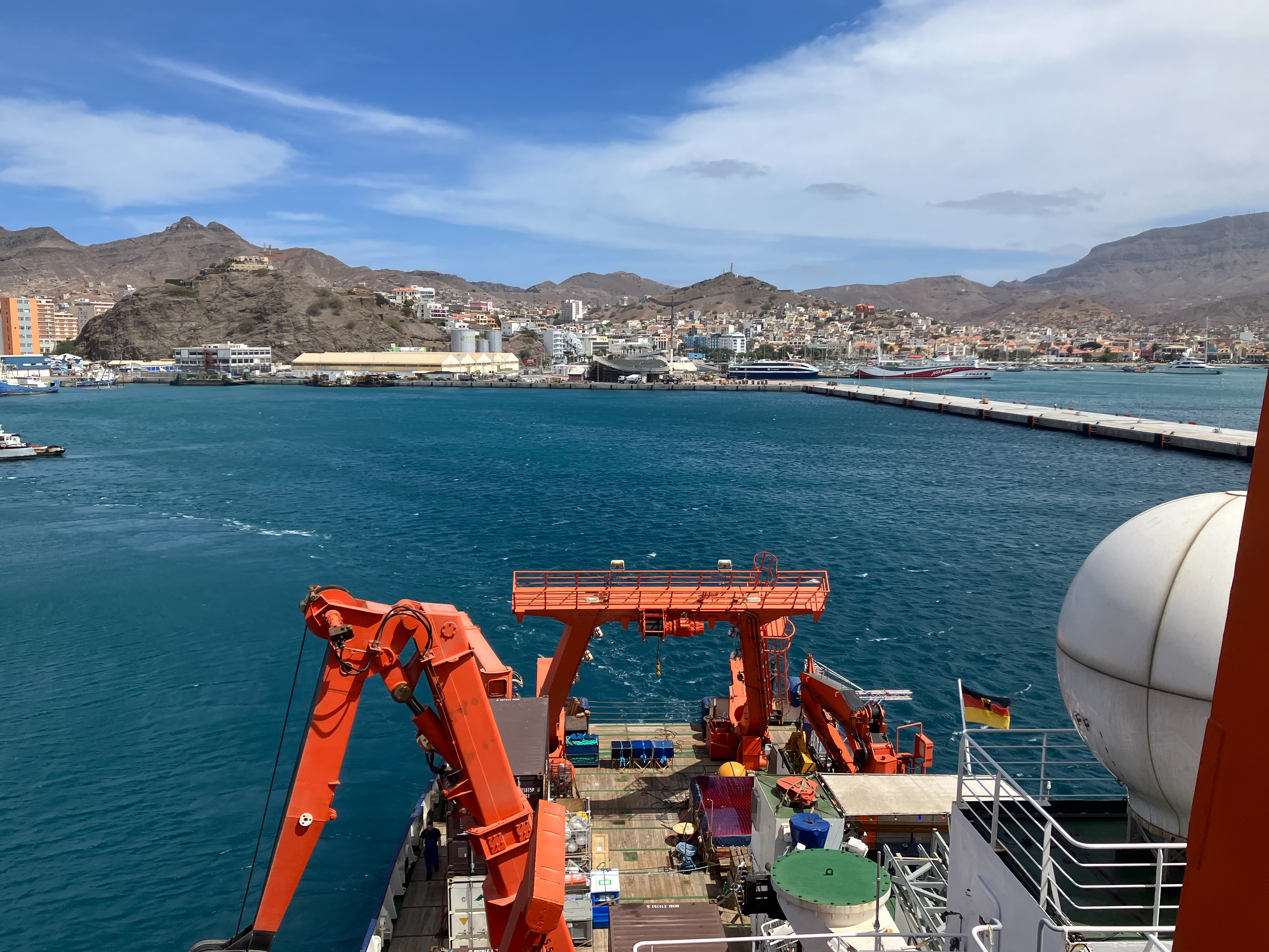 Das Forschungsschiff METEOR läuft aus dem Hafen von Mindelo, Kap Verden, aus. Foto: Peter Brandt, GEOMAR