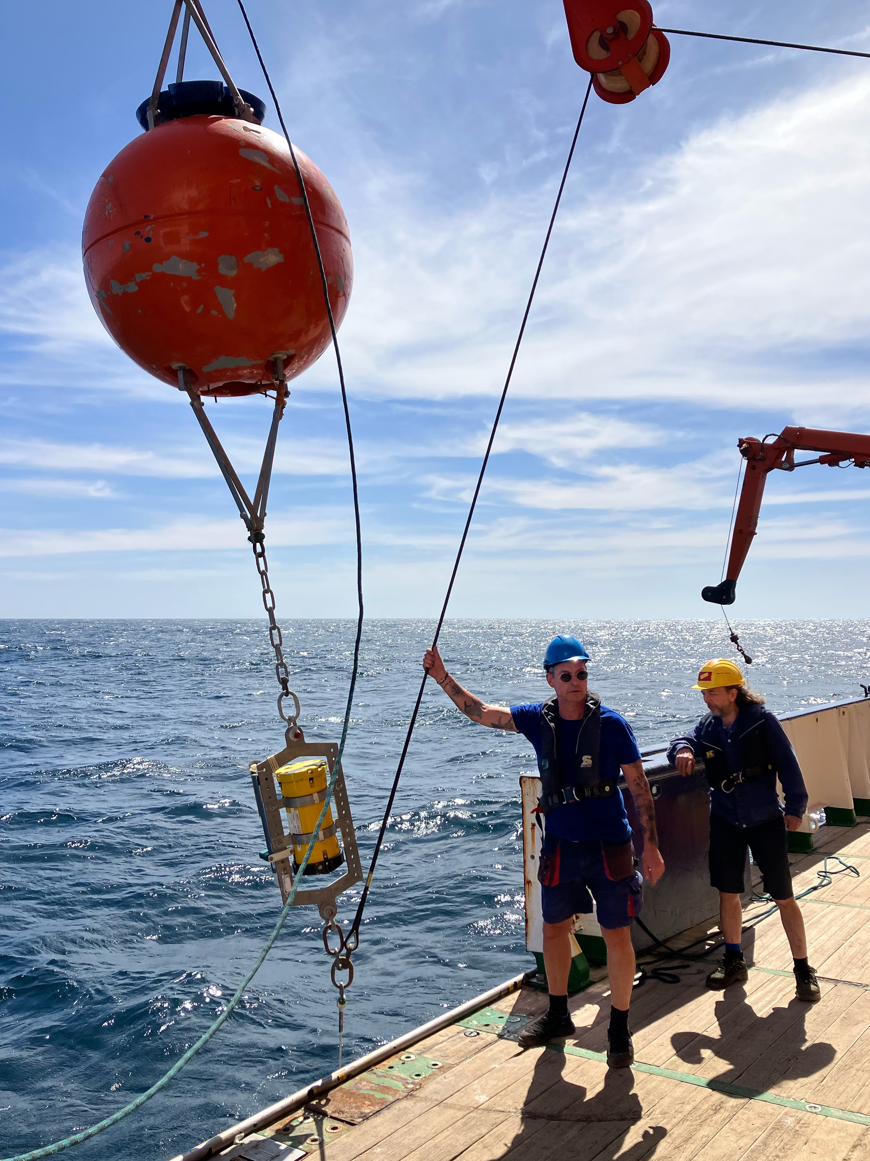 Eine Verankerung mit einem ADCP (Acoustic Doppler Current Profiler) zur akustischen Messung der Geschwindigkeit von Meeresströmungen in verschiedenen Wassertiefen wird ausgebracht. Foto: Peter Brandt, GEOMAR
