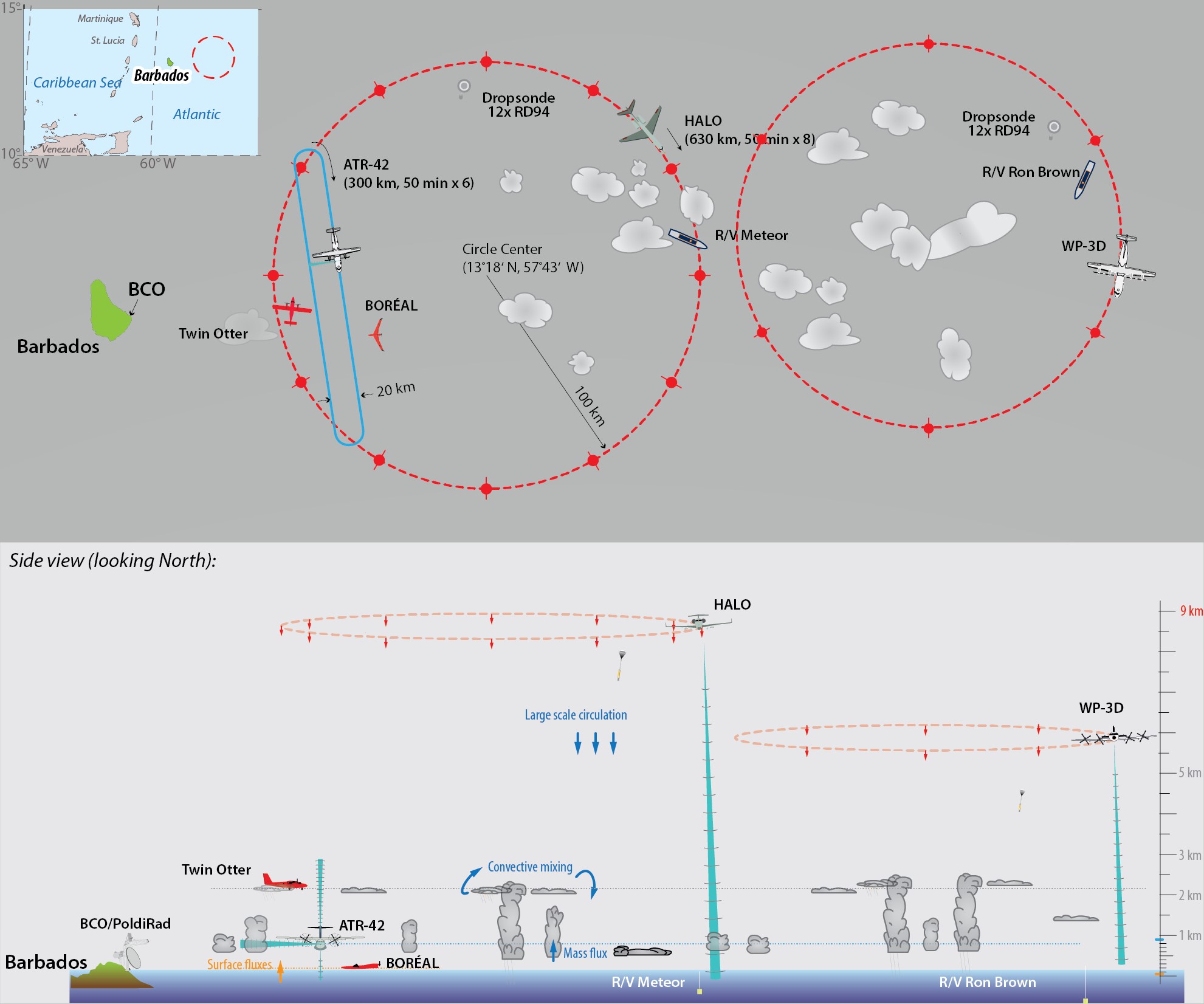 Die Messkampagne findet östlich und südlich der Karibikinsel Barbados statt. Es werden fünf Forschungsflugzeuge und vier Forschungsschiffe eingesetzt, die mit einer Bodenmessstation, dem Barbados-Wolken-Observatorium, einer großen Anzahl von autonomen Messrobotern in Luft und Wasser und Satellitenfernerkundungsmethoden kombiniert werden. Die Gesamtkoordination von EUREC4A, an der sich mehr als 40 Partnerinstitutionen beteiligen, wird von Prof. Bjorn Stevens, Max-Planck-Institut für Meteorologie (MPI-M), Hamburg, und Dr. Sandrine Bony, Laboratoire de Météorologie Dynamique, Paris, durchgeführt. Ihre Initiative baut auf einer jahrzehntelangen Zusammenarbeit mit Wissenschaftlern aus Barbados am Caribbean Institute for Meteorology and Hydrology (CIMH) unter der Leitung von Dr. David Farrell auf und erweitert diese.