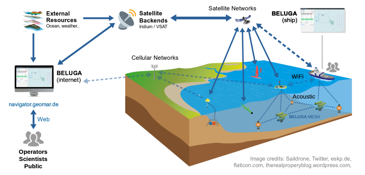 Abbildung 1 zeigt die verschiedenen Datenflüsse, die innerhalb des BELUGA Systems genutzt werden können. Je nach Plattformen und Einstellungen werden unterschiedliche Kommunikationskanäle genutzt. Während bei einem Einsatz auf See oft akustisch oder per WLAN mit eingesetzten Plattformen kommuniziert wird, senden andere Plattformen, die länger im Wasser bleiben, ihre Daten auch über Satellite. Neben der Anzeige der eingegangenen Daten direkt an Bord, in der Grafik dargestellt als BELUGA (ship), können die Daten zusätzlich in der öffentlich erreichbaren Version der Benutzeroberfläche, hier: BELUGA (internet), visualisiert werden. Auch die Darstellung von Daten ausschließlich in der öffentlichen Version, ohne lokales BELUGA Netzwerk an Bord, ist möglich. Zusätzlich können externe Daten, die über das Internet abgerufen werden, sowohl lokal als auch öffentlich angezeigt werden.