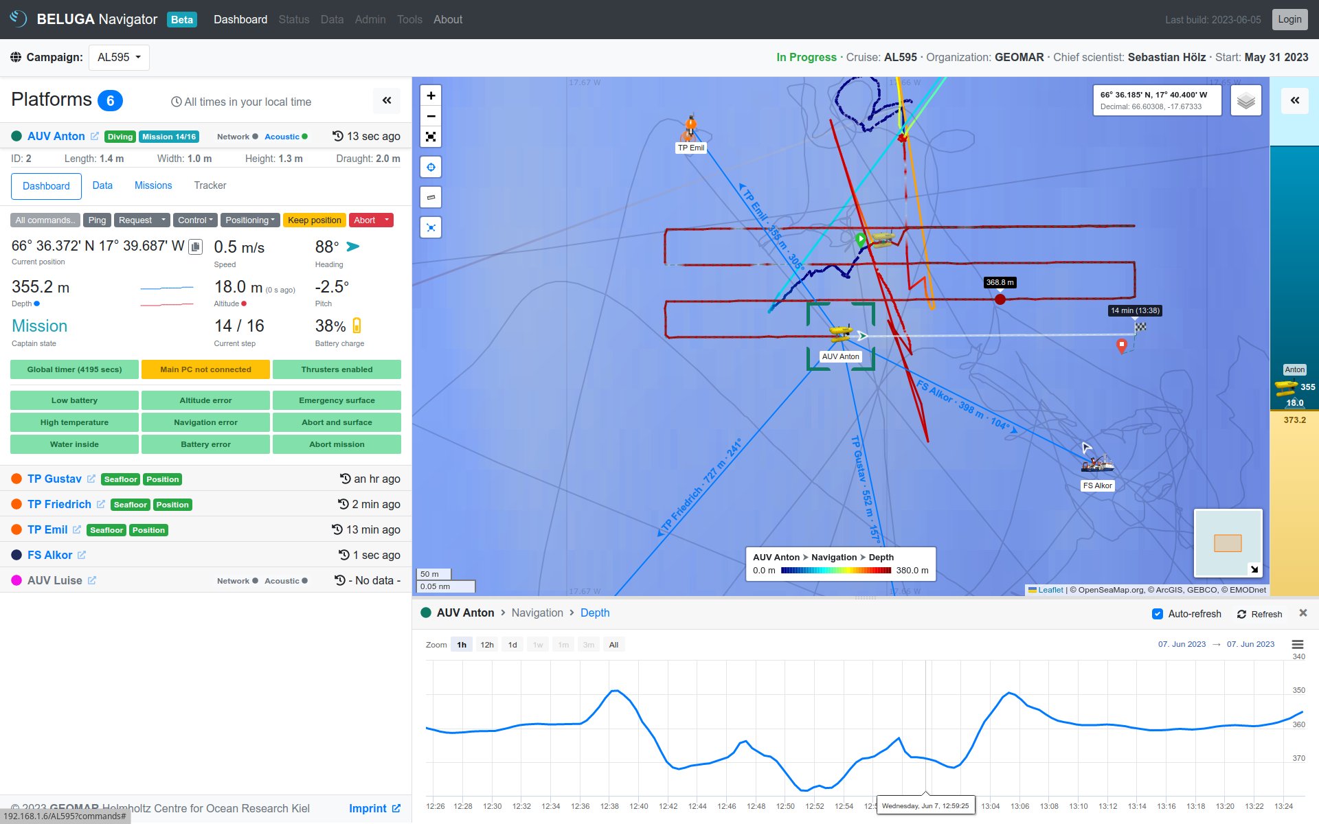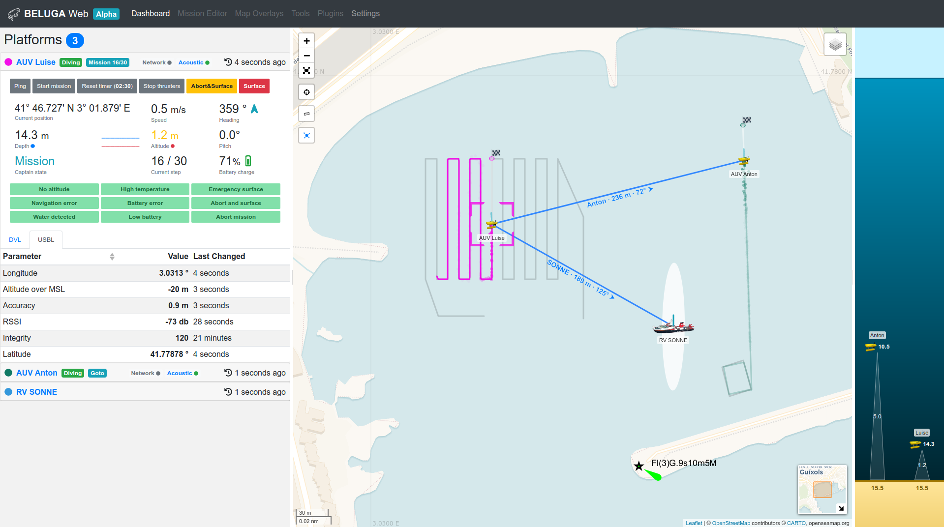 Das Frontend ist die grafische Benutzeroberfläche von BELUGA (Abbildung 2), über welche das gesamte Gerätenetzwerk überwacht und gesteuert werden kann. Hier werden alle Daten zusammengeführt, übersichtlich dargestellt und die Positionen der Fahrzeuge zusammen mit weiteren Informationen (Wetter, Bathymetrie, Ozeandaten) in einer Karte visualisiert. Dies ermöglicht den Anwendern, die aktuelle Situation im und über Wasser mit einem Blick zu erfassen und die einzelnen Fahrzeuge zu steuern.