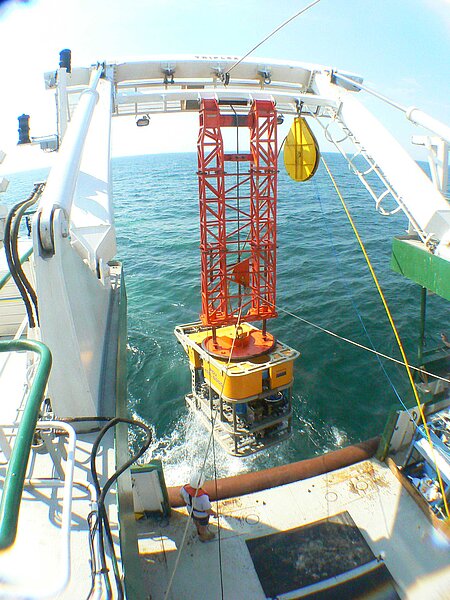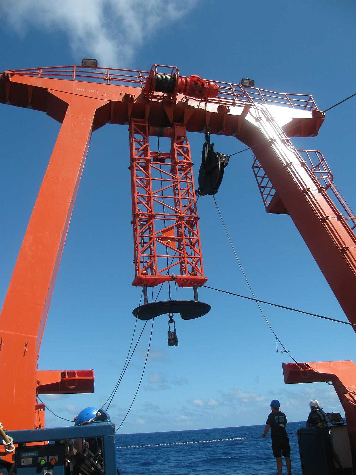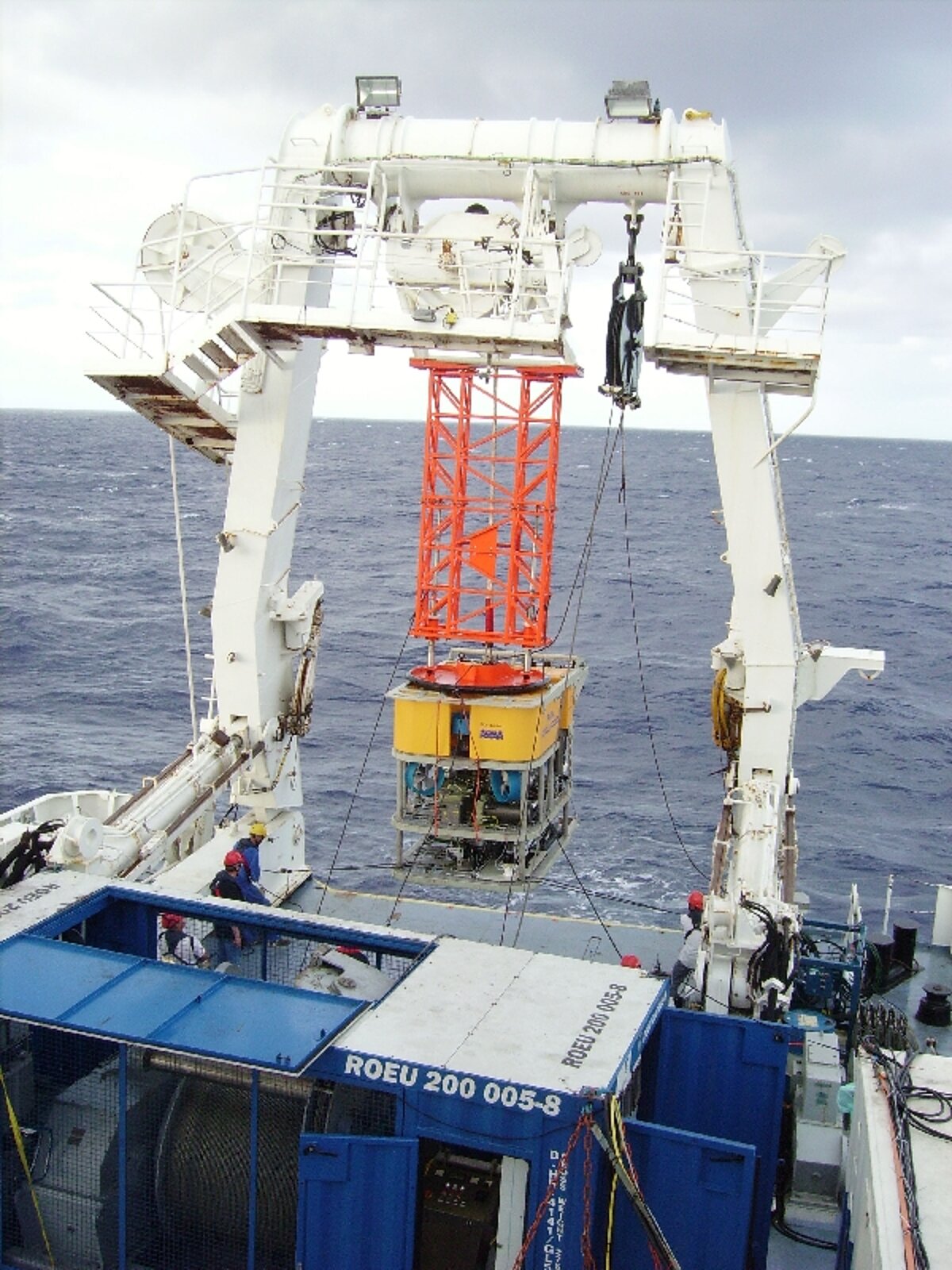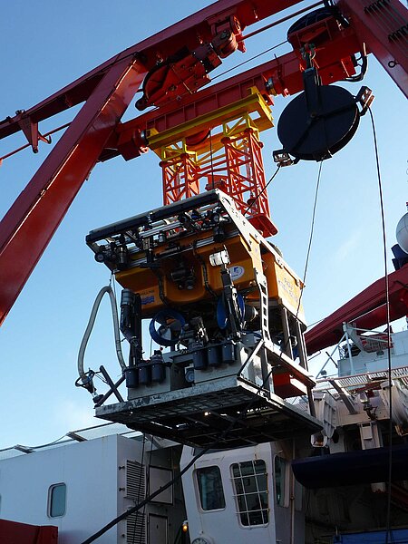 Das ROV wird mit Hilfe einer am A-Rahmen befindlichen Hilfswinde angehoben und ausgesetzt oder geborgen. Das Umbilical wird dabei durch einen ebenfalls am A-Rahmen befestigten Block geführt, um es möglichst wenig Zugbelastung auszusetzen.