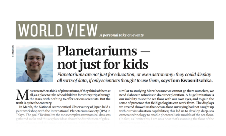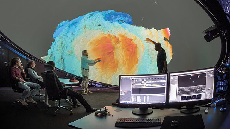 - Immersive Visualisierung, d.h. der digitale Nachbau des Ozeanbodens als virtuelle, die Betrachter umgebende Welt im Labor, frei von den Sachzwängen einer seegehenden Expedition. Vom Laptop über Datenbrillen bis hin zu raumfüllenden VR-Simulatoren reicht die Spanne unserer Werkzeuge, um den Meeresboden zunächst erfahrbar zu machen, ihn gleichzeitig aber auch quantitativ und wissenschaftlich zu vermessen.