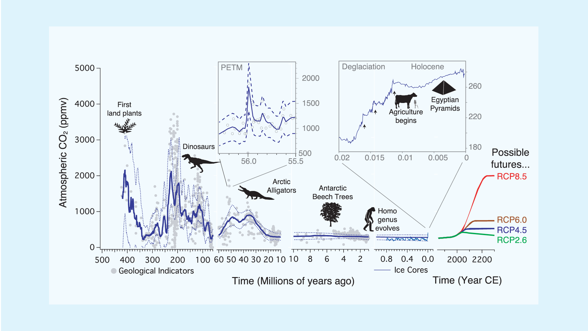 Ein weiteres Problem ist, dass der heutige Anstieg von CO2-Konzentrationen so rasant voranschreitet, dass das Klimasystem gar keine Zeit hat sich an diese schnellen Änderungen im Energiehaushalt anzugleichen, es hinkt immer hinterher. Das liegt vor allem an der Trägheit des Ozeans und der Eisschilde, die hunderte bis tausende von Jahre brauchen, um unter anderen Rahmenbedingungen ein neues Gleichgewicht zu finden. Unser Zukunftsklima wird somit nicht im Gleichgewicht sein. Klimaepisoden der Vergangenheit mit hohen Treibhausgaskonzentrationen waren hingegen im Gleichgewicht. Den Unterschied kann man bereits bei heutigen CO2-Konzentrationen erkennen. Zum Beispiel war es vor 3 Millionen Jahren wesentlich wärmer als heute und der Meeresspiegel war um mehrere Meter höher, obwohl die atmosphärischen CO2-Konzentrationen vergleichbar waren. Ein direkter Vergleich zwischen Vergangenheit und Zukunft hinkt deswegen, obwohl diese Klimaepisoden uns natürlich einen Einblick auf das Gleichgewichtsklima geben können, das die Erde dann letztendlich erreichen wird.