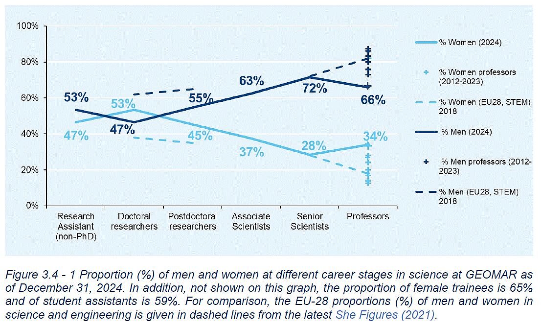 Das GEOMAR zeichnet sich bereits durch ein sehr ausgewogenes Verhältnis von Männern und Frauen auf der Ebene der Doktorandinnen und befristeten Postdoktorandinnen aus, der Anteil der Frauen liegt hier bei 53% und 45%. Bei den permanenten Wissenschaftlerstellen und Professuren fällt er jedoch geringer aus, er liegt hier bei 28% und 34% (Stand: Dezember 2024).