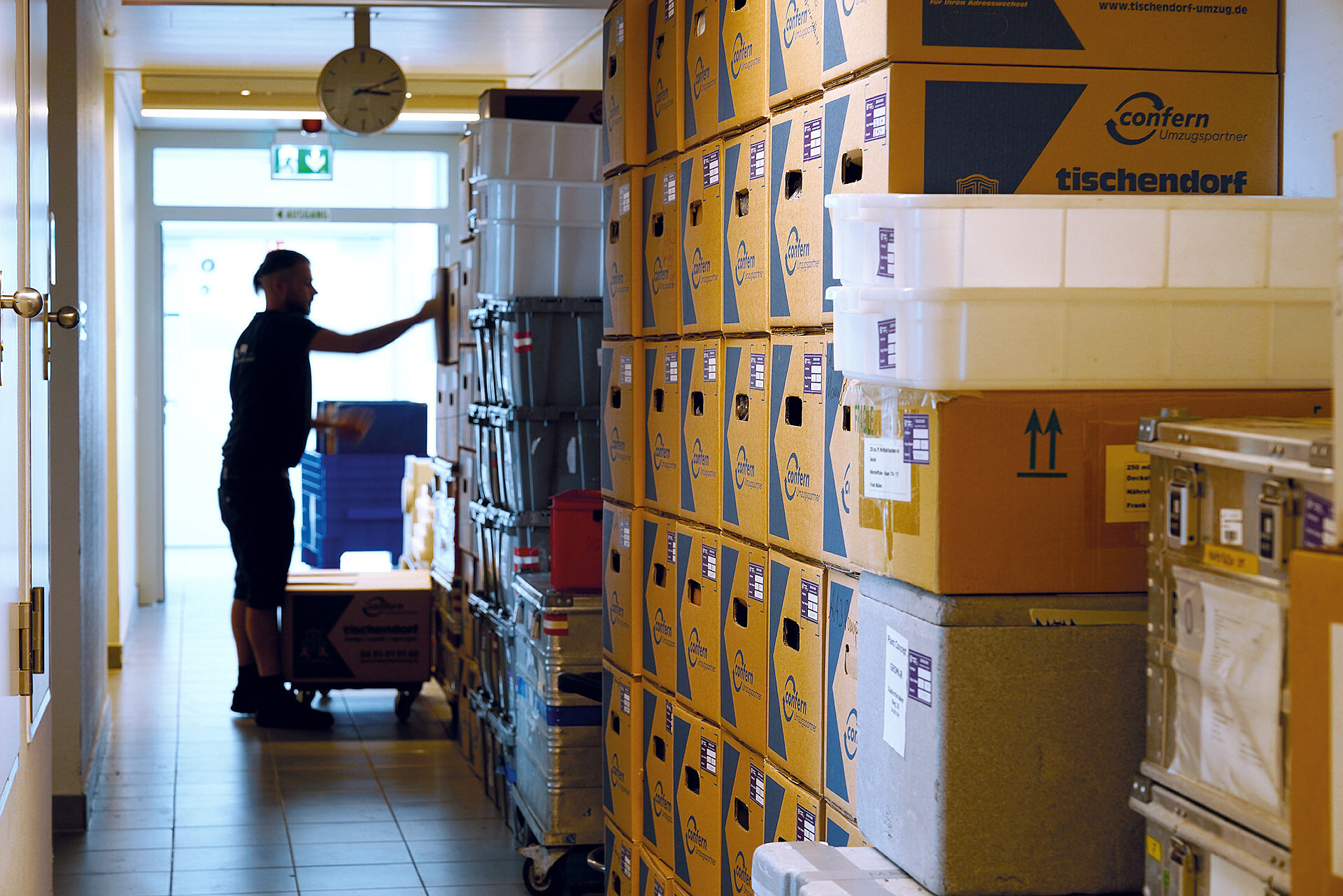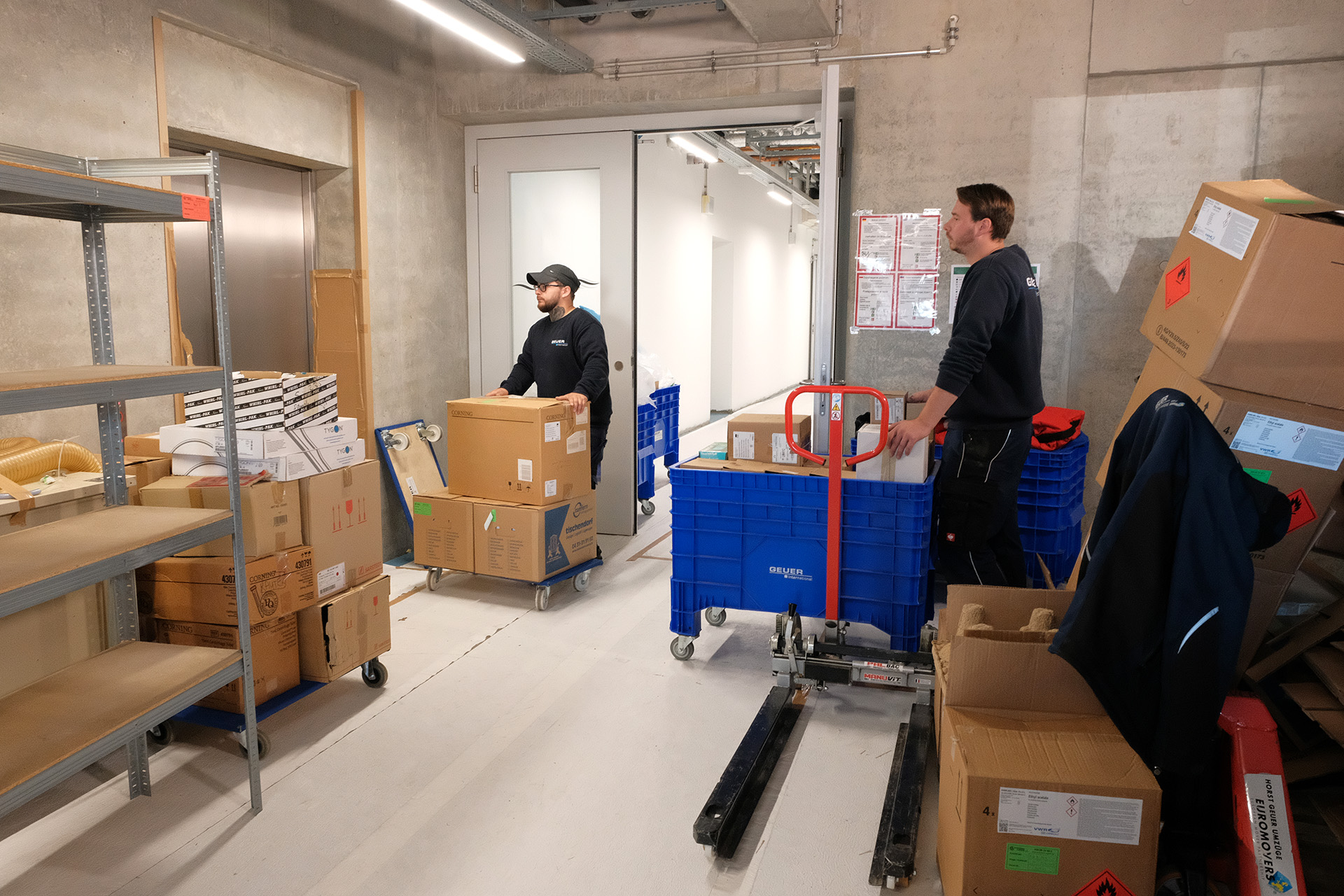 GEOMAR-Mitarbeiter:innen beim Sortieren und Einlagern im Neubau.