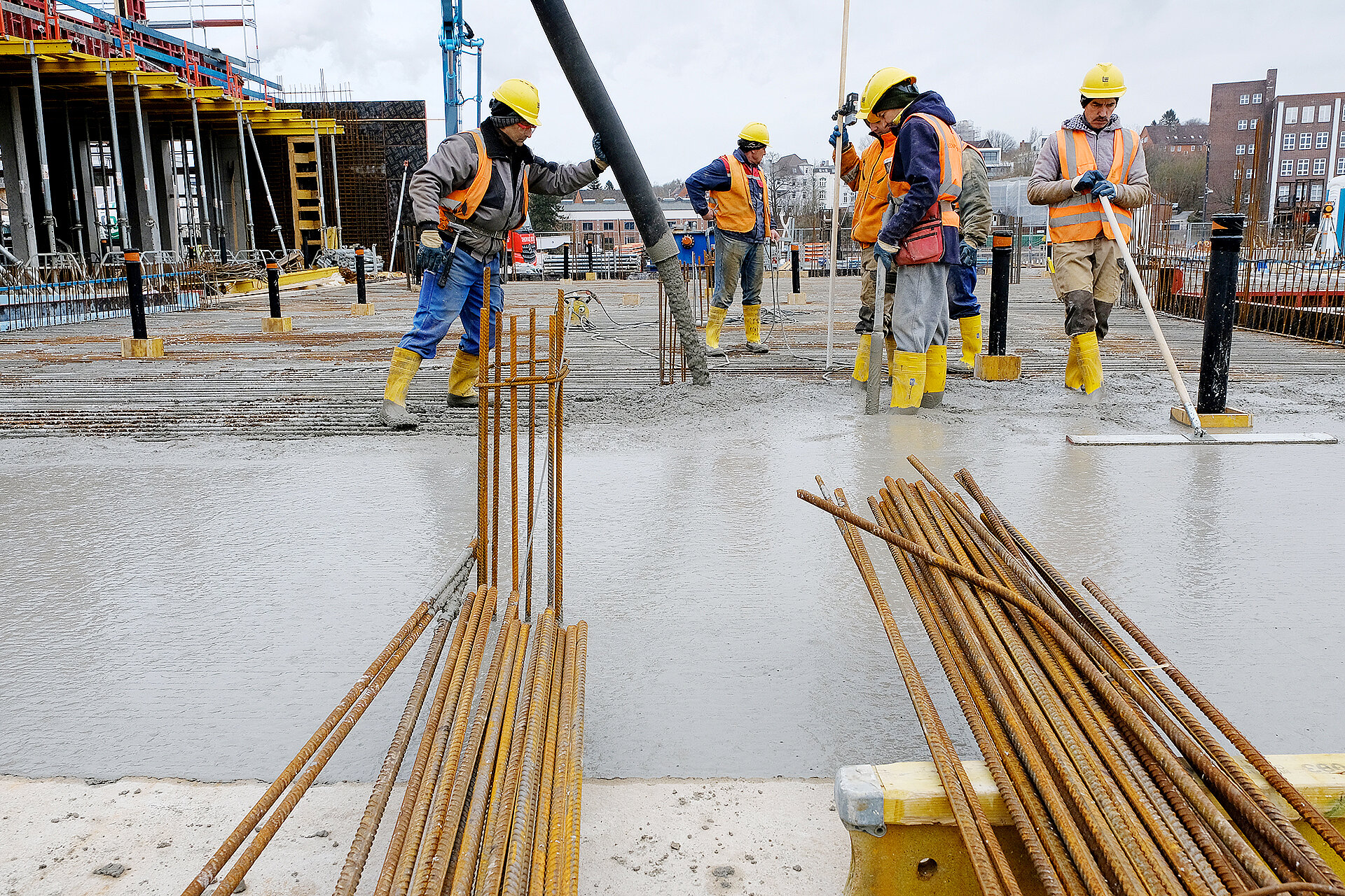 05 | Der Frischbeton wird umgehend in die Bewehrung einer Bodenplatte eingebaut. Foto: Jan Steffen/GEOMAR
