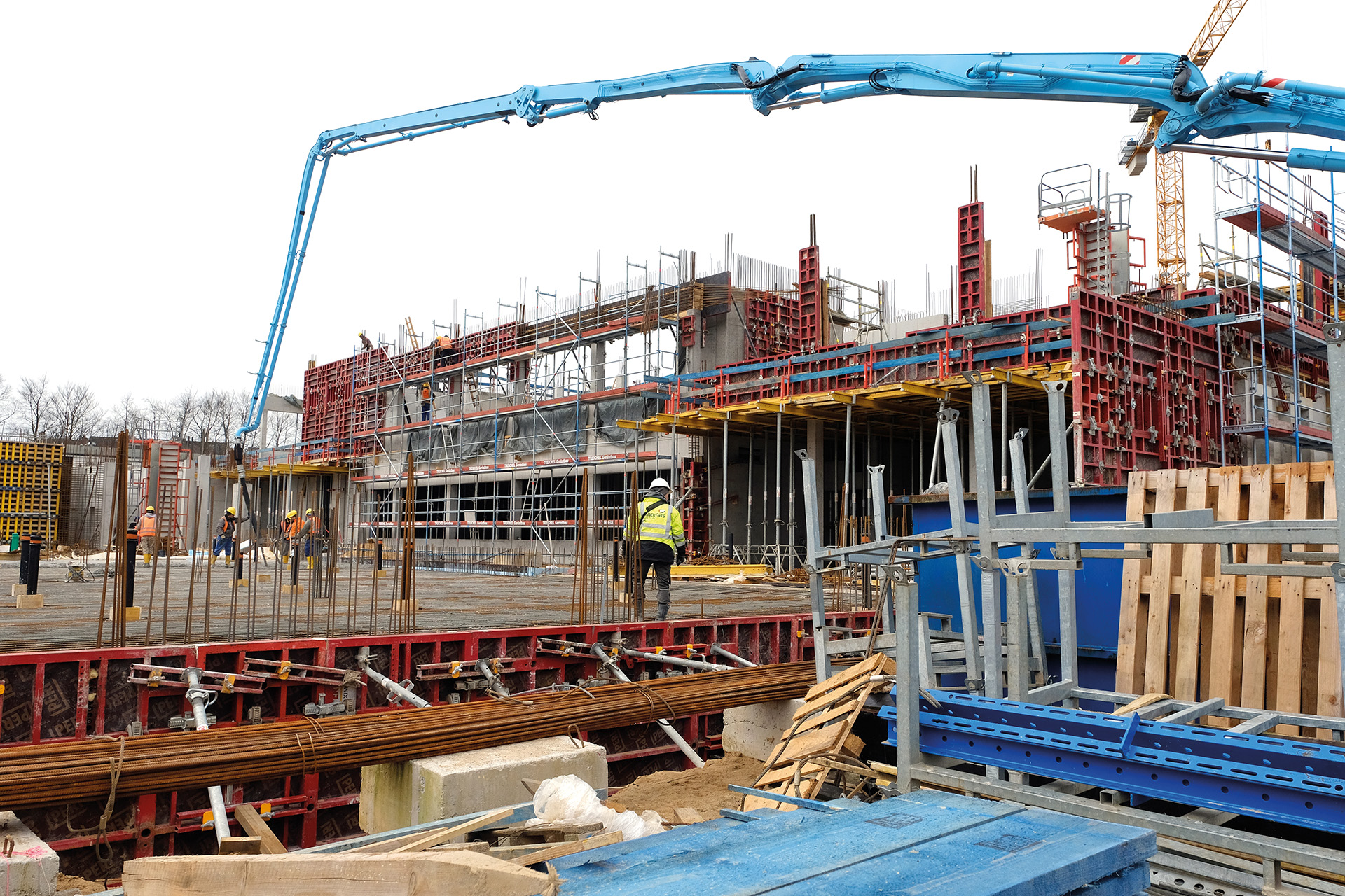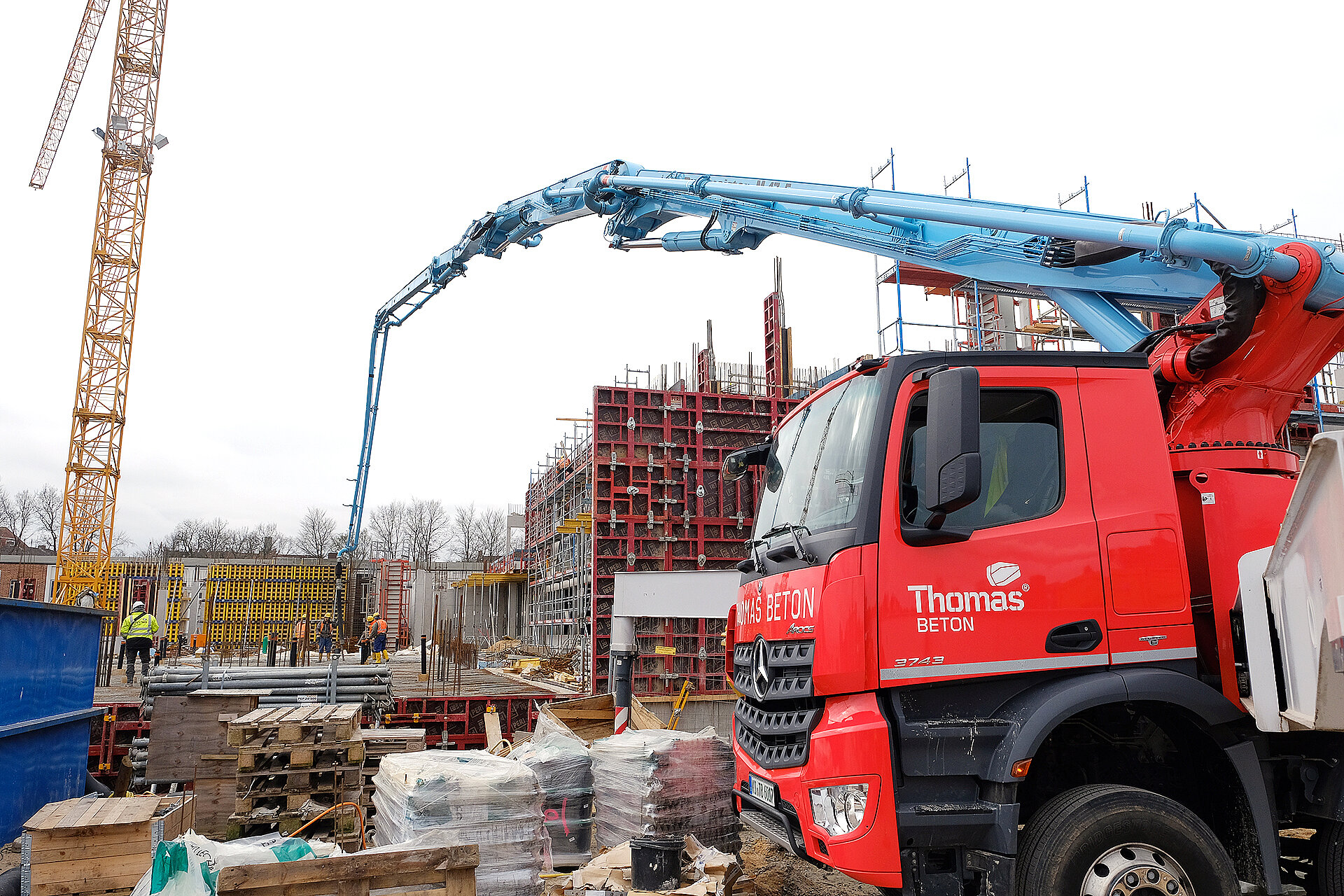 03 | Mit einer Autobetonpumpe wird der angelieferte Beton bis an die benötigte Stelle gepumpt. Foto: Jan Steffen/GEOMAR