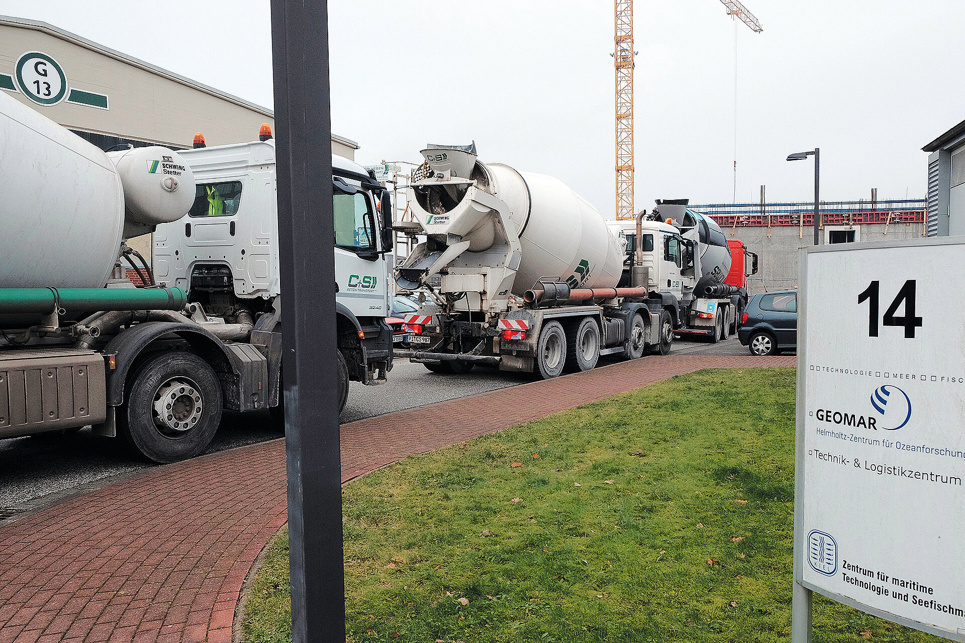 02 | LKW-Stau am TLZ: Betonmischwagen warten auf ihren Einsatz für den Rohbau. Foto: Jan Steffen/GEOMAR