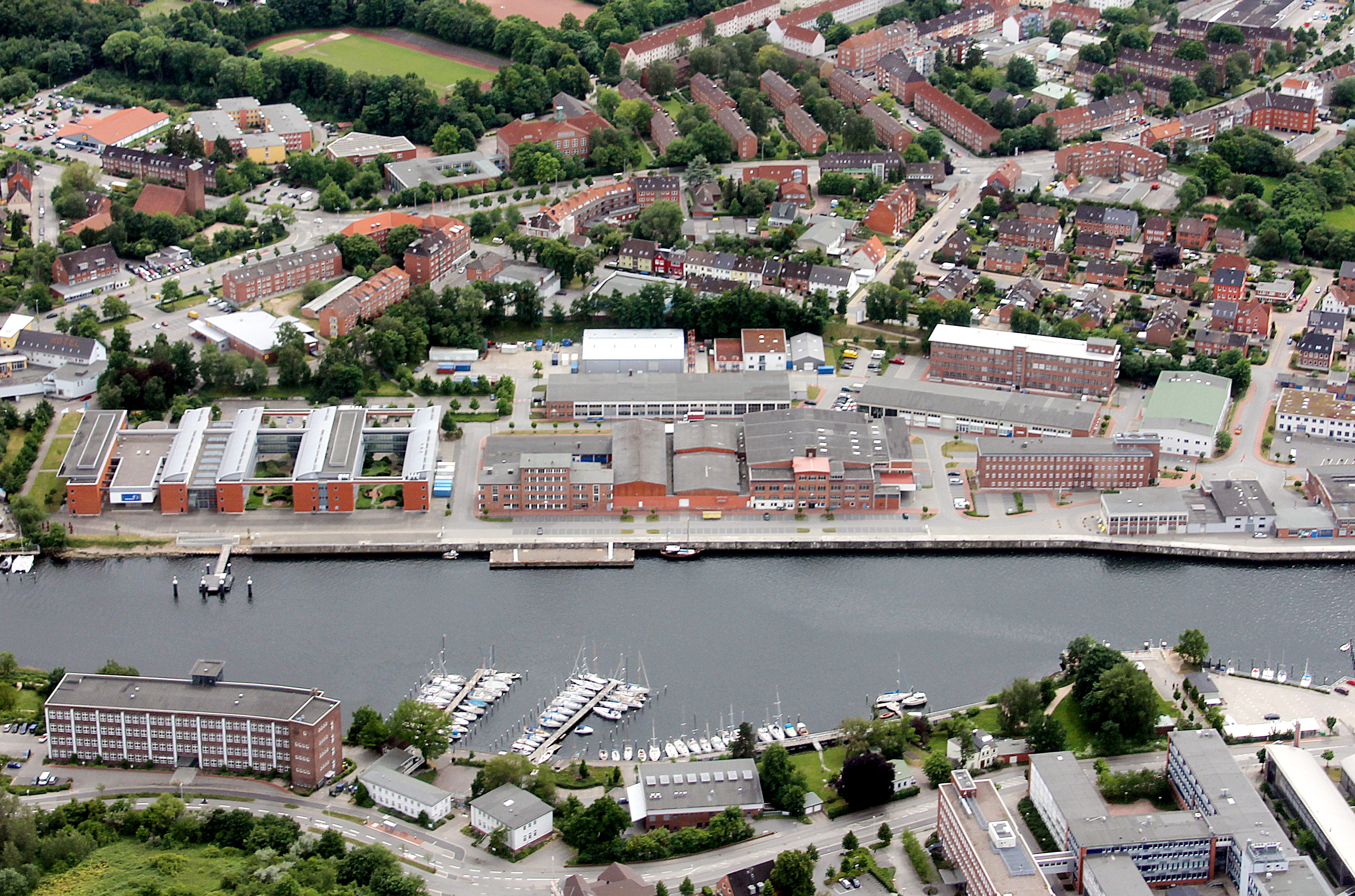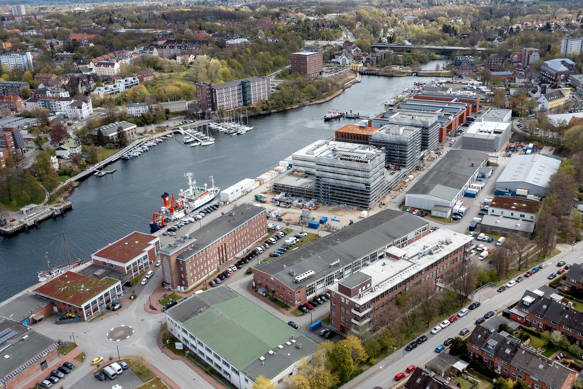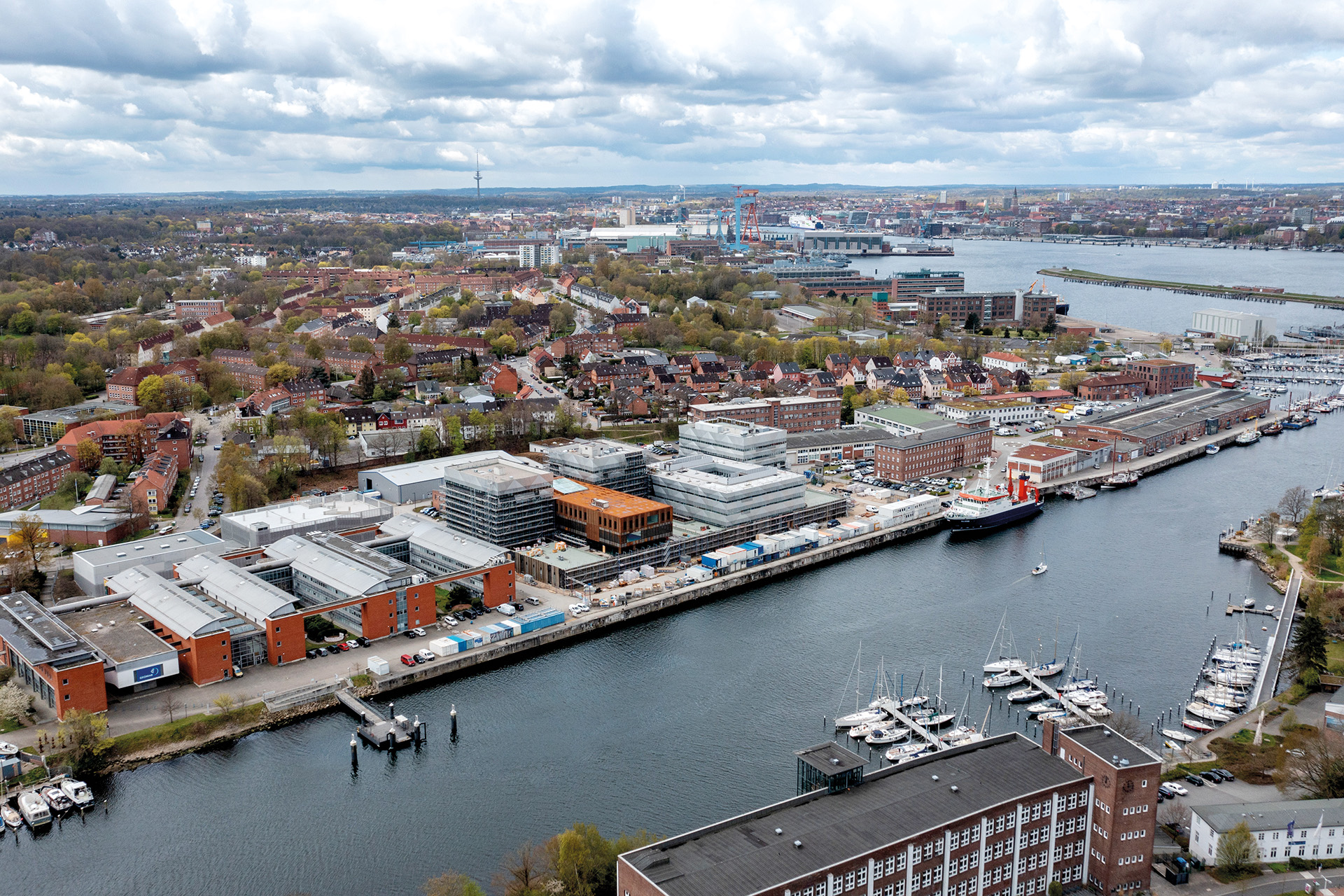Luftaufnahme mit Übersicht auf die Schwentine, das Seefischmarktgelände und die Kieler Förde. Foto: Jens Klimmeck/GEOMAR