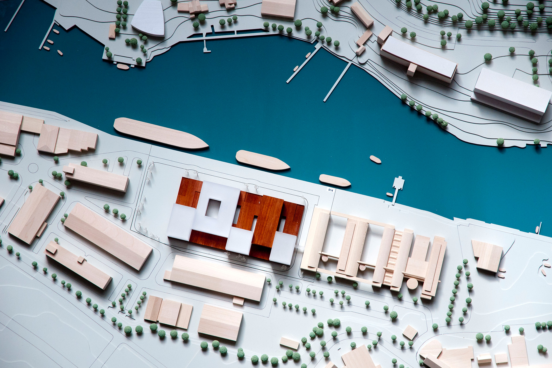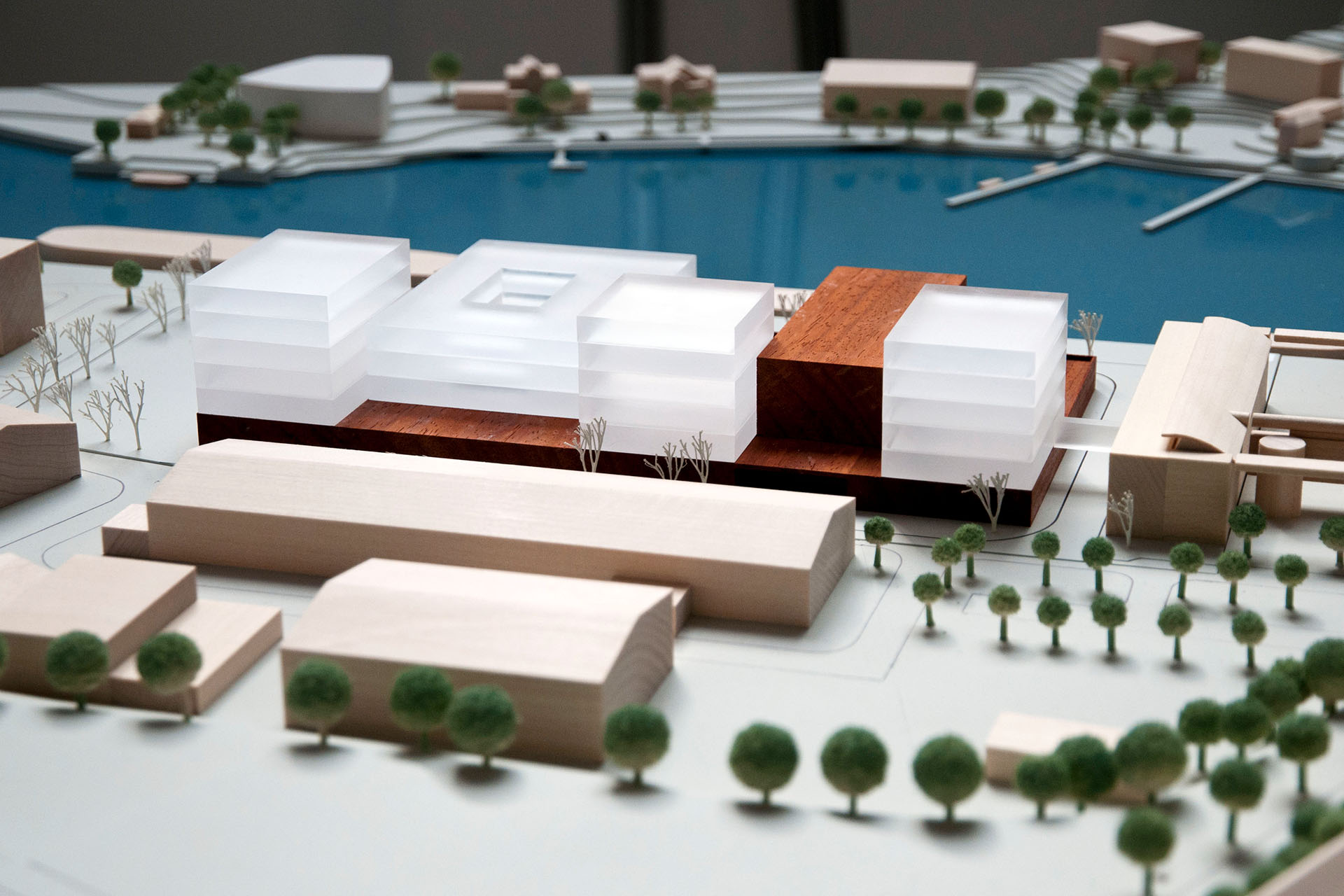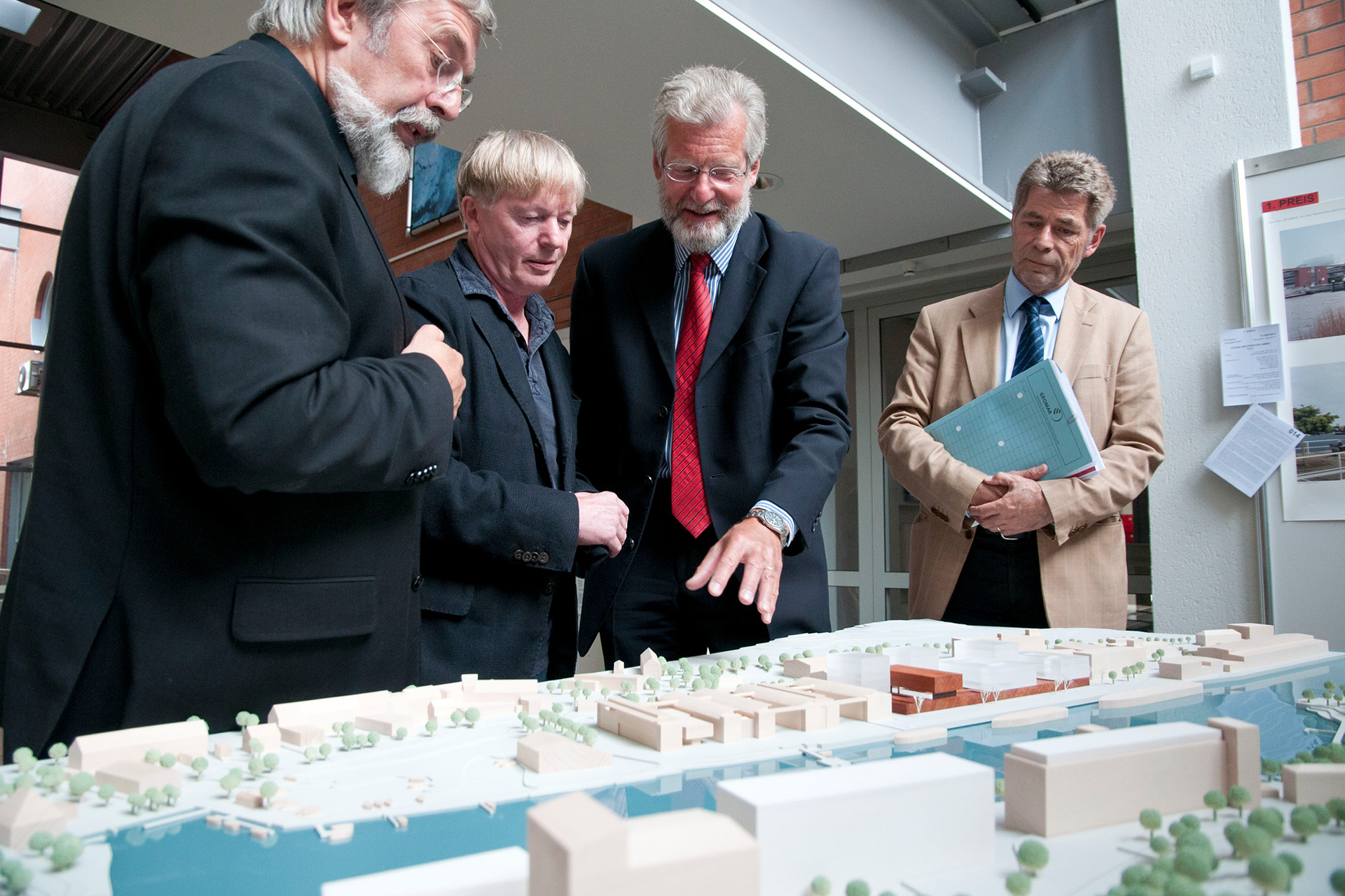 Ausblick am Modell: Prof. Dr. Peter Herzig, GEOMAR-Direktor bis 2021 (mitte) mit Staatssekretär Rolf Fischer (links), Architekt Alfred Nieuwenhuizen von Staab Architekten (2.von links) und Michael Wagner, GEOMAR-Verwaltungsdirektor bis 2018 (rechts). Foto: Jan Steffen/GEOMAR