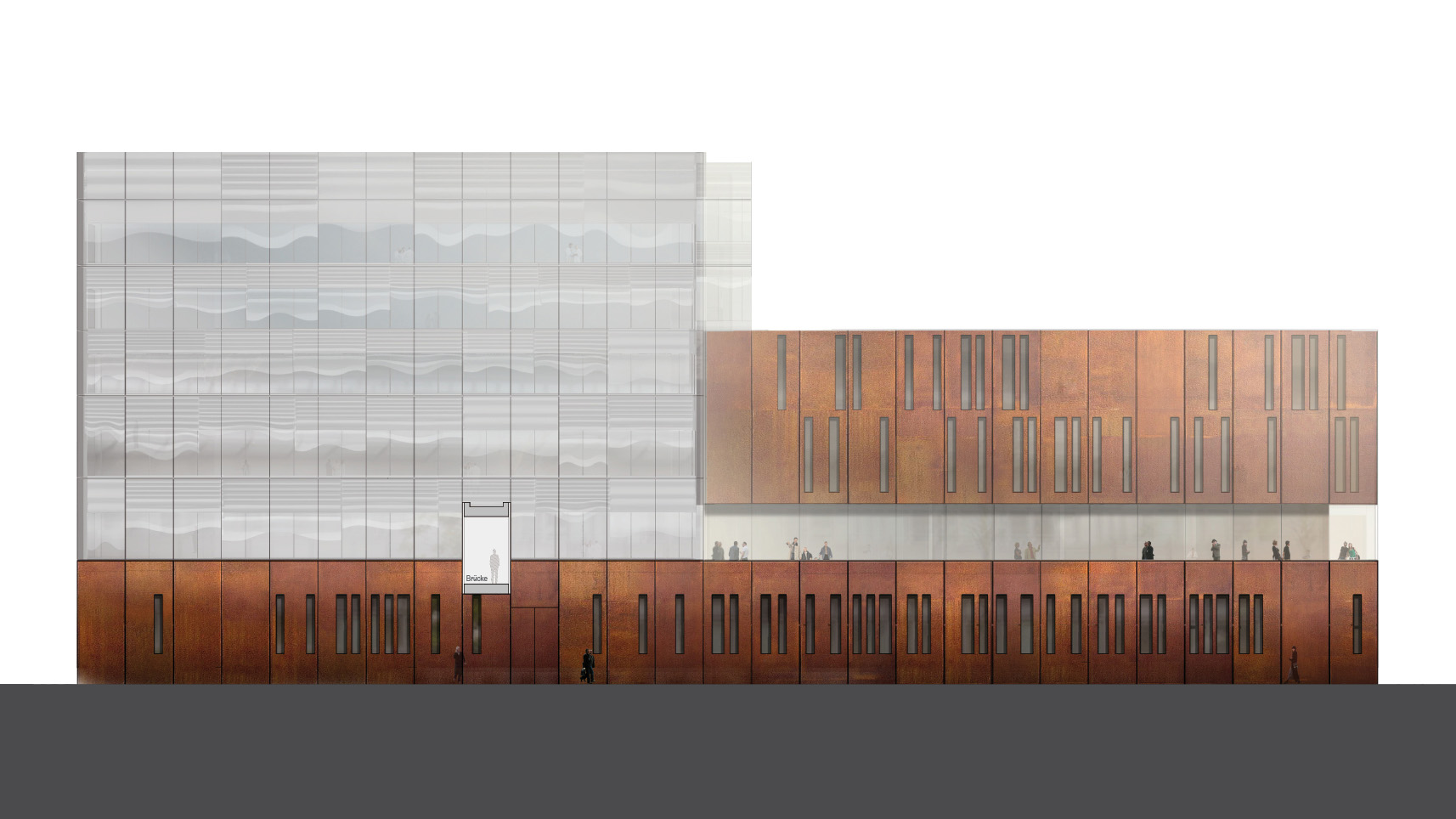 Die Berliner Architekten wählten einen Entwurf, der sich durch einen kräftigen Kontrast zwischen dem Sockel aus Cortenstahl und der Glasfassade der aufgesetzten Gebäudekörper auszeichnet. Illustration: Staab Architekten